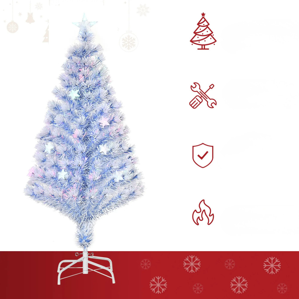 A műfenyő PVC ágakkal, 16 db LED-del, valamint több színben váltakozó fényvezető üvegszálakkal rendelkezik, amelyek egyszerre biztosítják a hangulatos, mégis energiatakarékos fényáradatot. Az összecsukható ágaknak köszönhetően az össze- és szétszerelés gyors és egyszerű, a stabil fém talp pedig biztos tartást nyújt egész ünnepi időszakban.