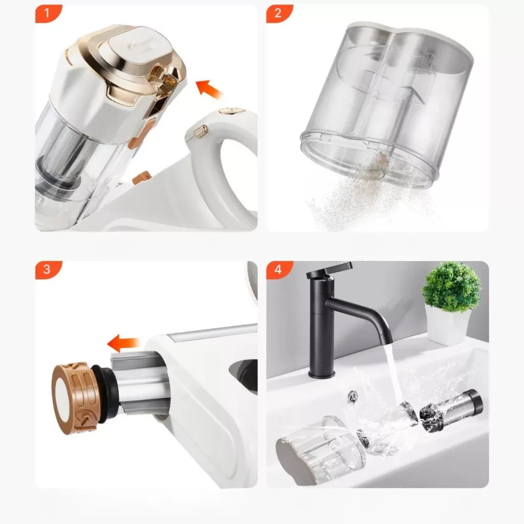 A dupla portartály és kétszintű szűrőrendszer (rozsdamentes acél előszűrő + HEPA-szűrő) egyszerre választja le a nagyobb por- és szennyeződésrészecskéket, illetve fogja fel a mikroszkopikus, akár 0,3 mikrométeres részecskéket is. A 650 ml-es porgyűjtő csökkenti a gyakori ürítés szükségességét, a több rétegű szűrés pedig tisztább kifújt levegőt eredményez – különösen előnyös allergiások, gyerekekkel vagy háziállatokkal élő családok számára.