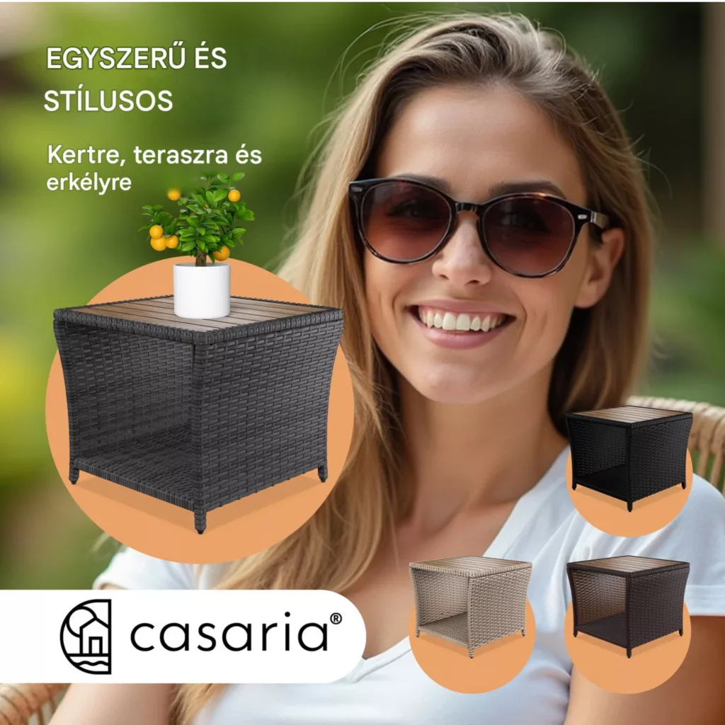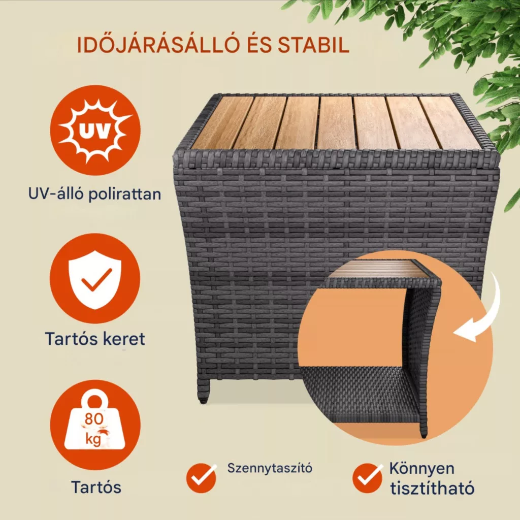 Ez a modern kialakítású polyrattan kerti asztal akácfa lappal tökéletes választás, ha Ön egy elegáns, ugyanakkor sokoldalúan használható bútort keres. Kompakt méretének köszönhetően ideális erkélyre, teraszra vagy akár nappaliba is, miközben természetes megjelenésével harmonikusan illeszkedik bármilyen környezetbe.
