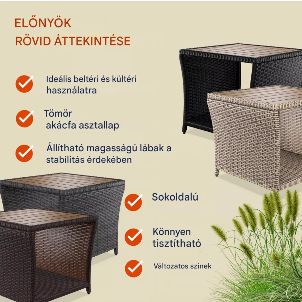 Ez a kerti asztal ideális választás, ha Ön egy tartós, esztétikus és helytakarékos megoldást keres. A természetes akácfa és a modern polyrattan kombinációja garantáltan feldobja kültéri vagy beltéri életterét.