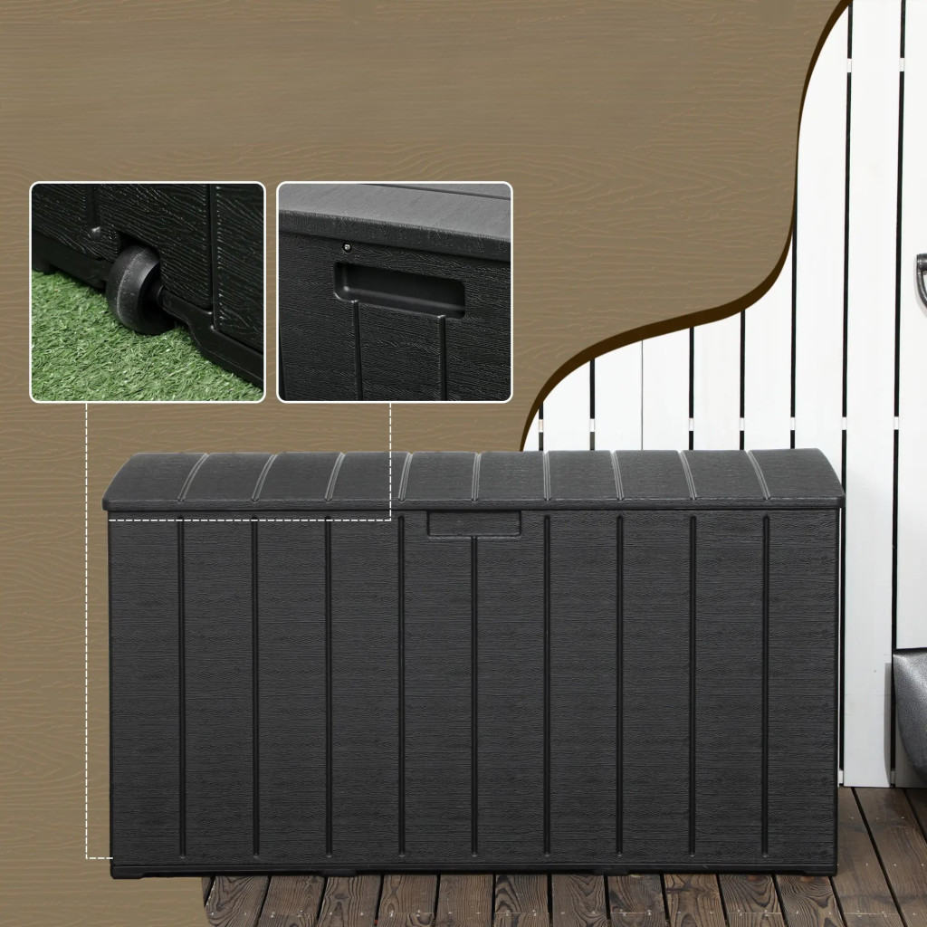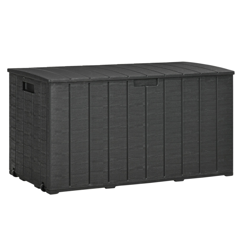 Kerti tároló láda 366L műanyag párnatartó box kerekekkel, süllyesztett fogantyúkkal, fahatású felülettel