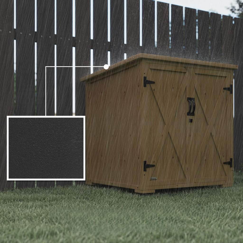 A kerti tároló szekrény aszfalt tetővel készült, amely hatékony védelmet biztosít az eső és a nedvesség ellen.