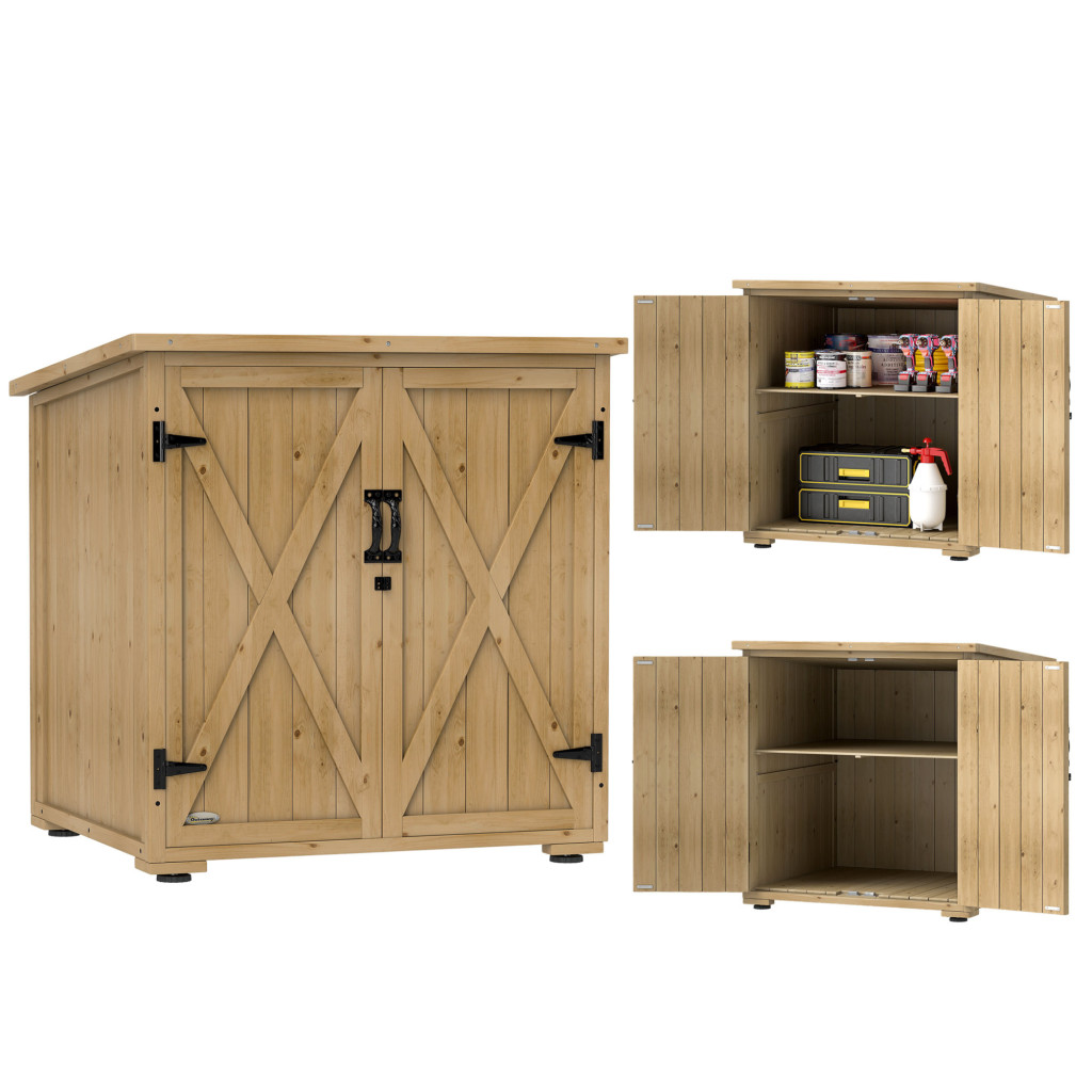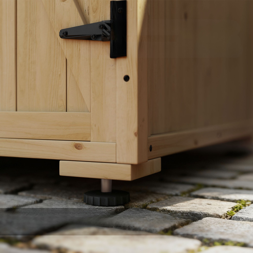 A fenyőfa kerti tárolószekrény stabil és tartós szerkezettel készült, amely ellenáll a kültéri használat során jelentkező igénybevételnek.