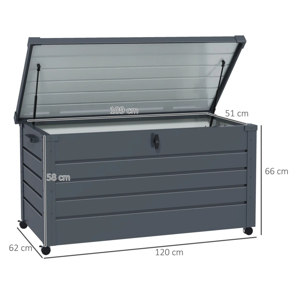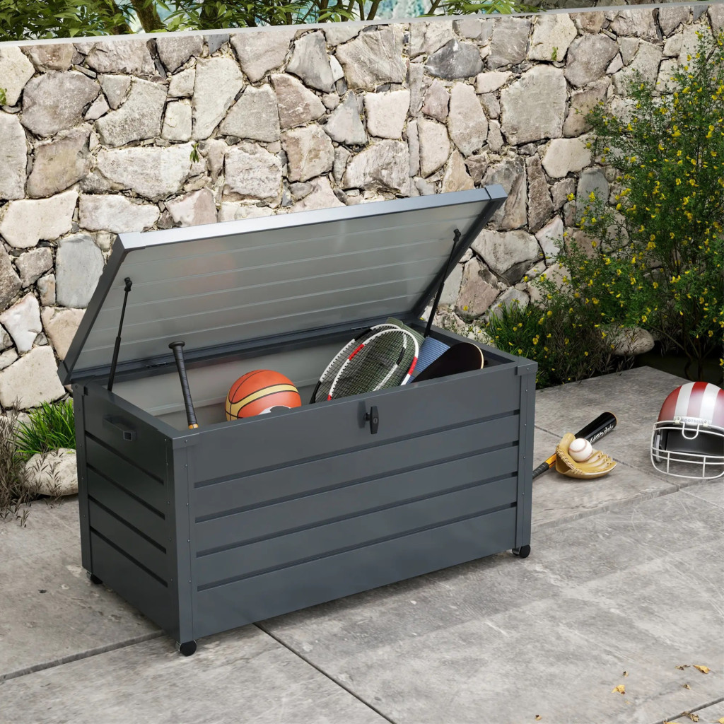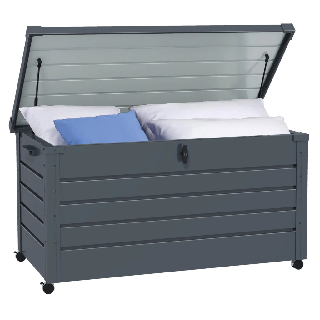 Kerti tároló láda 311L 120x62x65 cm nagyméretű kerekes kerti párnatartó box sötétszürke