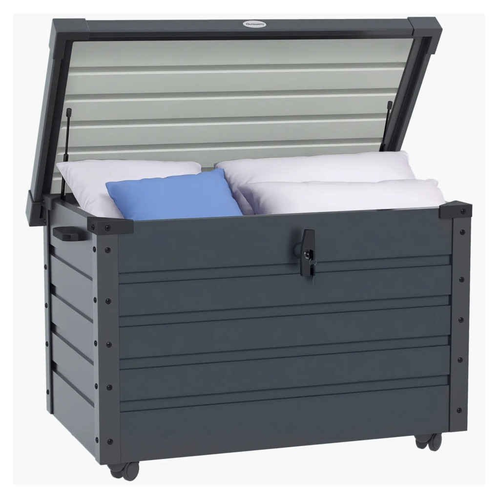 A kerekes kerti párnatartó láda lehetővé teszi a tároló egyszerű mozgatását.