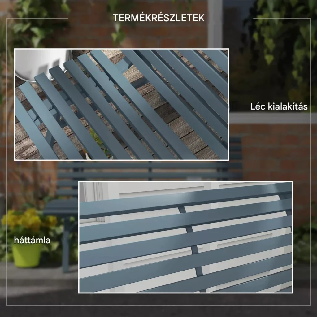 Ha egy modern megjelenésű, mégis rendkívül tartós kültéri ülőbútort keres, ez az alumínium kerti pad kiváló választás lehet. Letisztult kialakítása és elegáns kék színe friss, stílusos megjelenést kölcsönöz kertjének, teraszának vagy erkélyének.