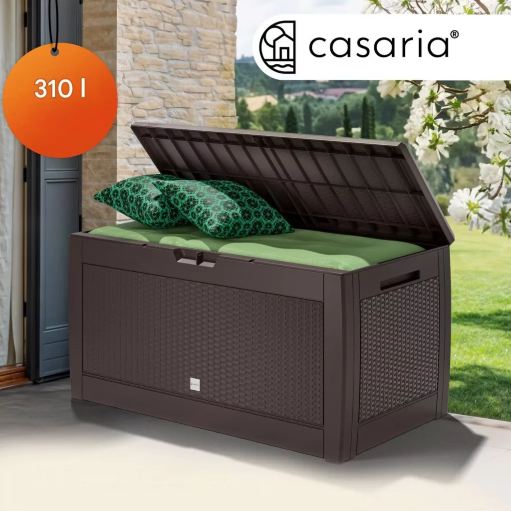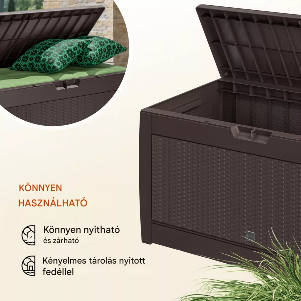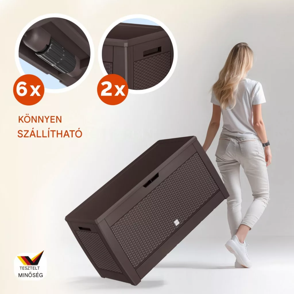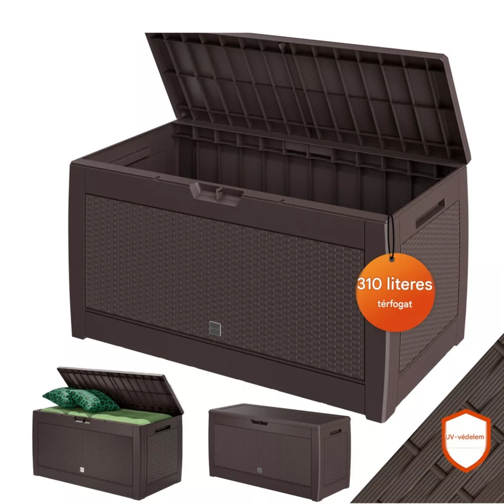 Ez a kerti tároló láda 310 literes kivitelben ideális választás, ha Ön egy tartós, praktikus és esztétikus tárolót keres. A nagy kapacitás, a könnyű mozgathatóság és a biztonságos kialakítás garantálja a kényelmes mindennapi használatot.