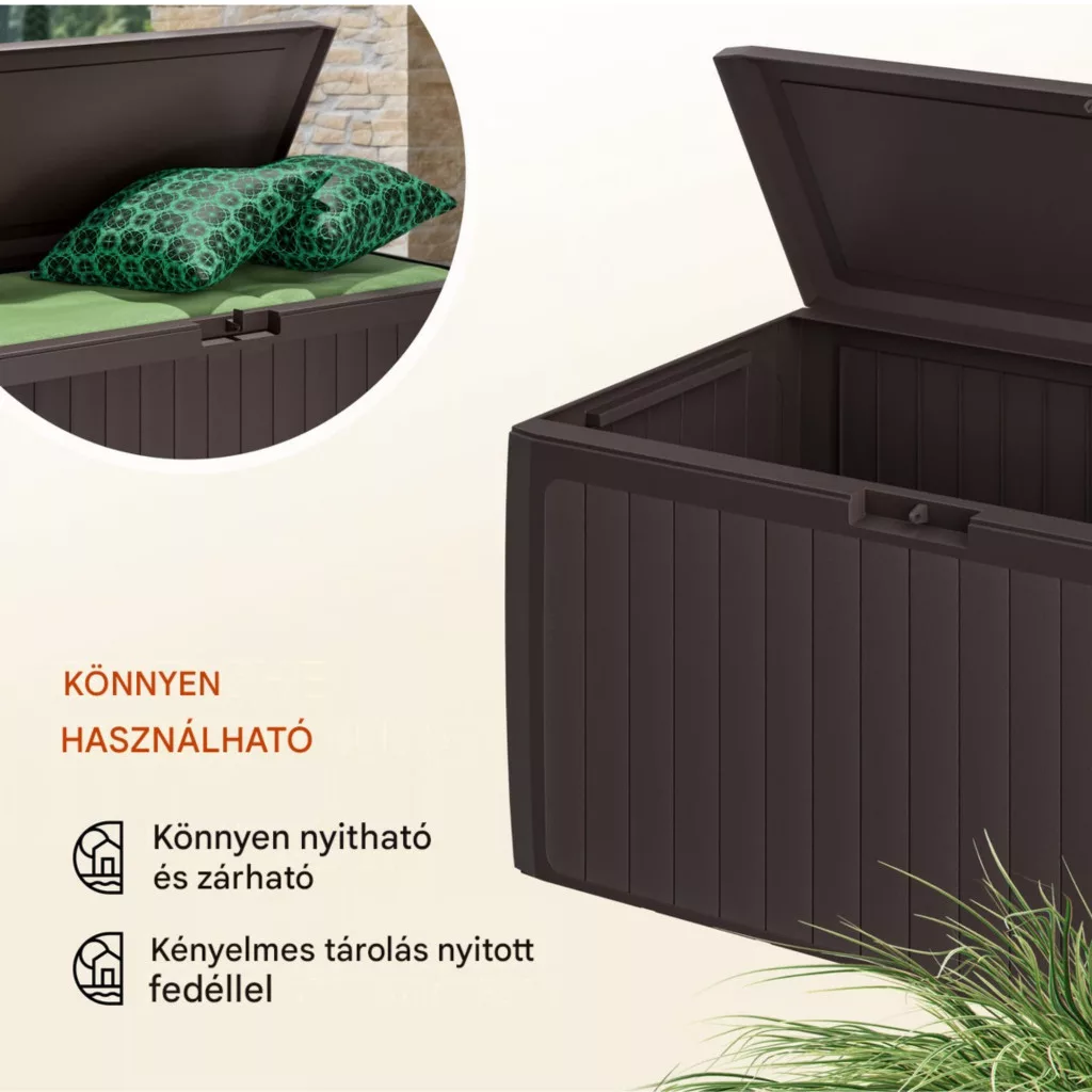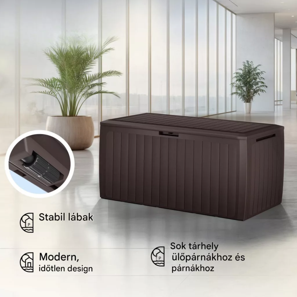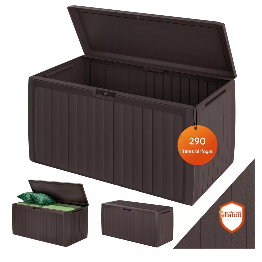 Ez a kerti tároló láda 290 literes kivitelben ideális választás, ha Ön rendezett és esztétikus megoldást keres kertjébe vagy teraszára. A modern panel hatású kerti tároló elegáns barna színben természetes megjelenést biztosít, amely harmonikusan illeszkedik bármilyen kültéri környezethez.