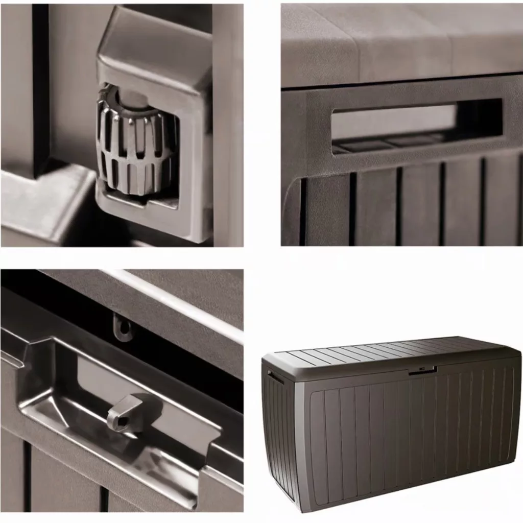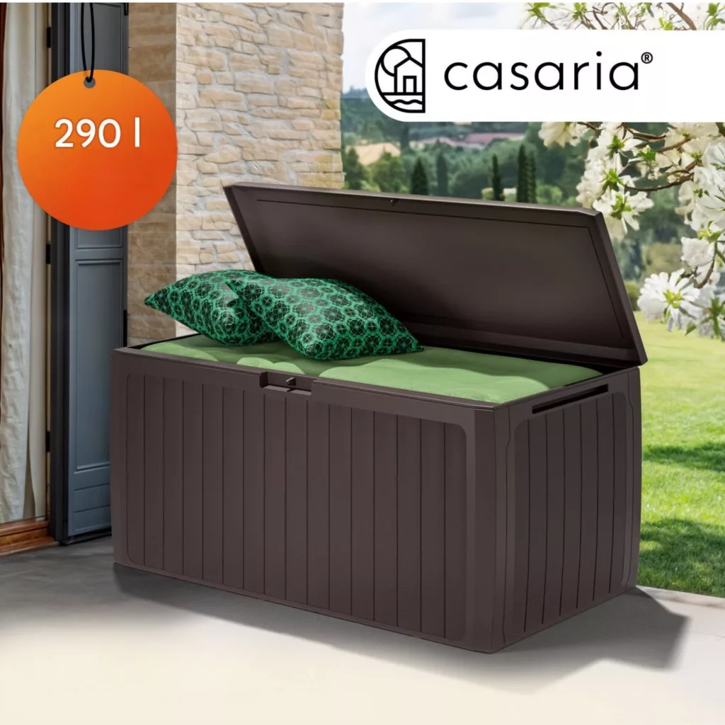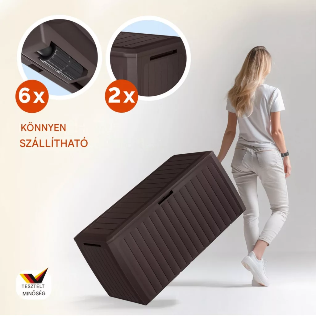 Ez a kerti tároló láda 290 literes kivitelben ideális választás, ha Ön rendezett és esztétikus megoldást keres kertjébe vagy teraszára. A modern panel hatású kerti tároló elegáns barna színben természetes megjelenést biztosít, amely harmonikusan illeszkedik bármilyen kültéri környezethez.