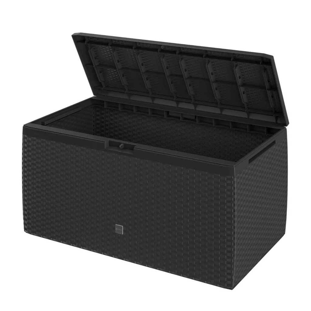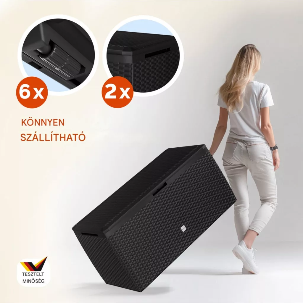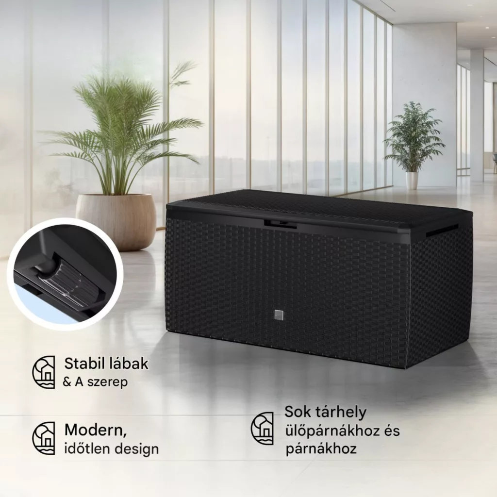 Ez a kerti tároló láda 290 literes kivitelben tökéletes kombinációja a tartósságnak, a funkcionalitásnak és a modern megjelenésnek. Ideális választás mindazok számára, akik praktikus és esztétikus tárolási megoldást keresnek kültérre.