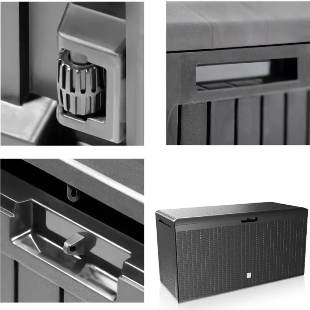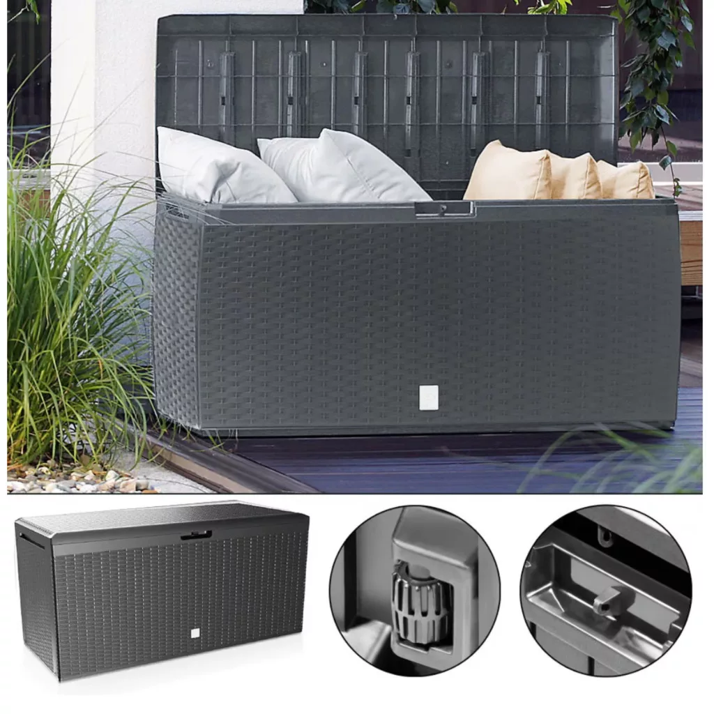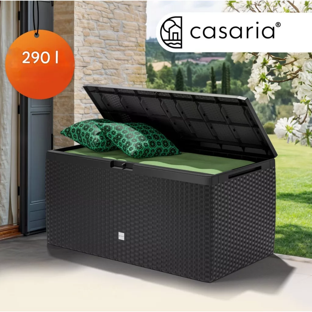 Ez a kerti tároló láda 290 literes kivitelben tökéletes kombinációja a tartósságnak, a funkcionalitásnak és a modern megjelenésnek. Ideális választás mindazok számára, akik praktikus és esztétikus tárolási megoldást keresnek kültérre.