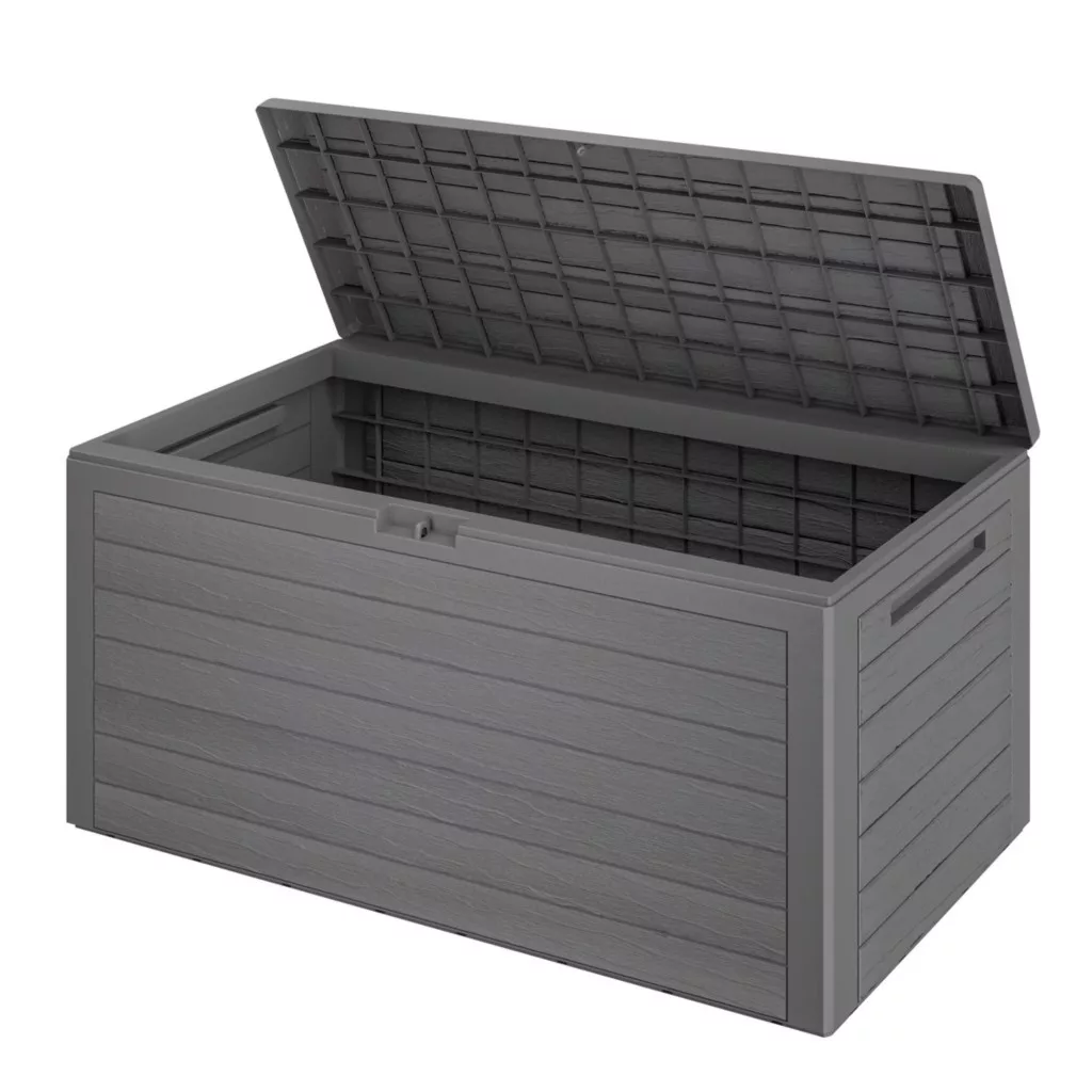Ez a kerti tároló láda 280 literes kivitelben ideális választás, ha Ön stílusos és praktikus tárolási megoldást keres kertjébe, teraszára vagy erkélyére. A letisztult megjelenésű fa hatású kerti tároló elegáns szürke színben harmonikusan illeszkedik bármilyen környezetbe.