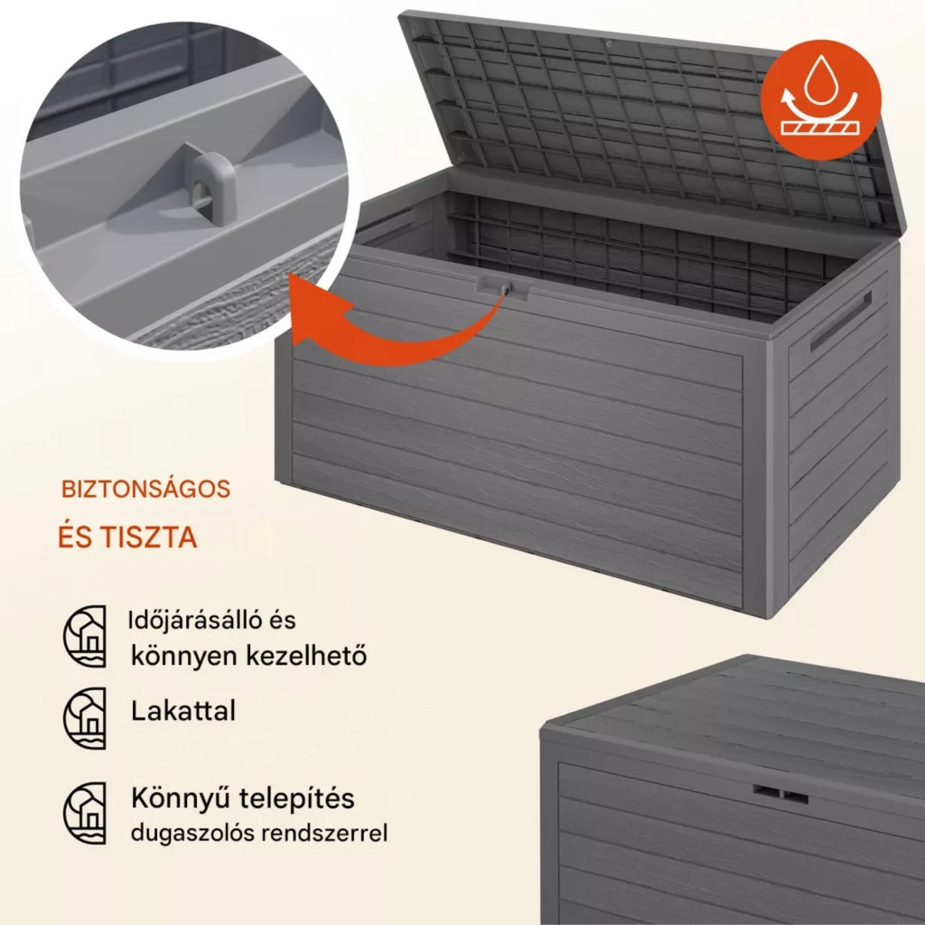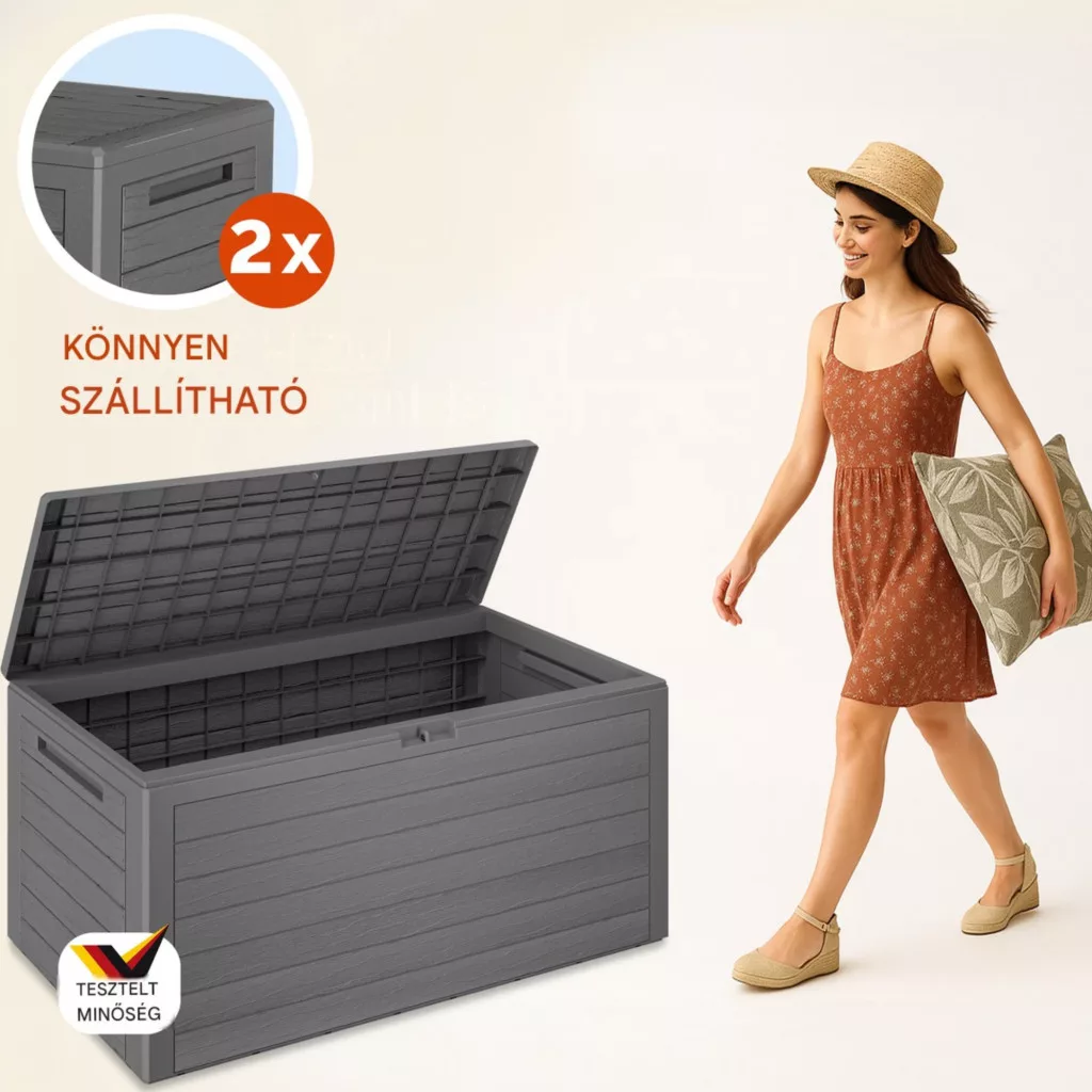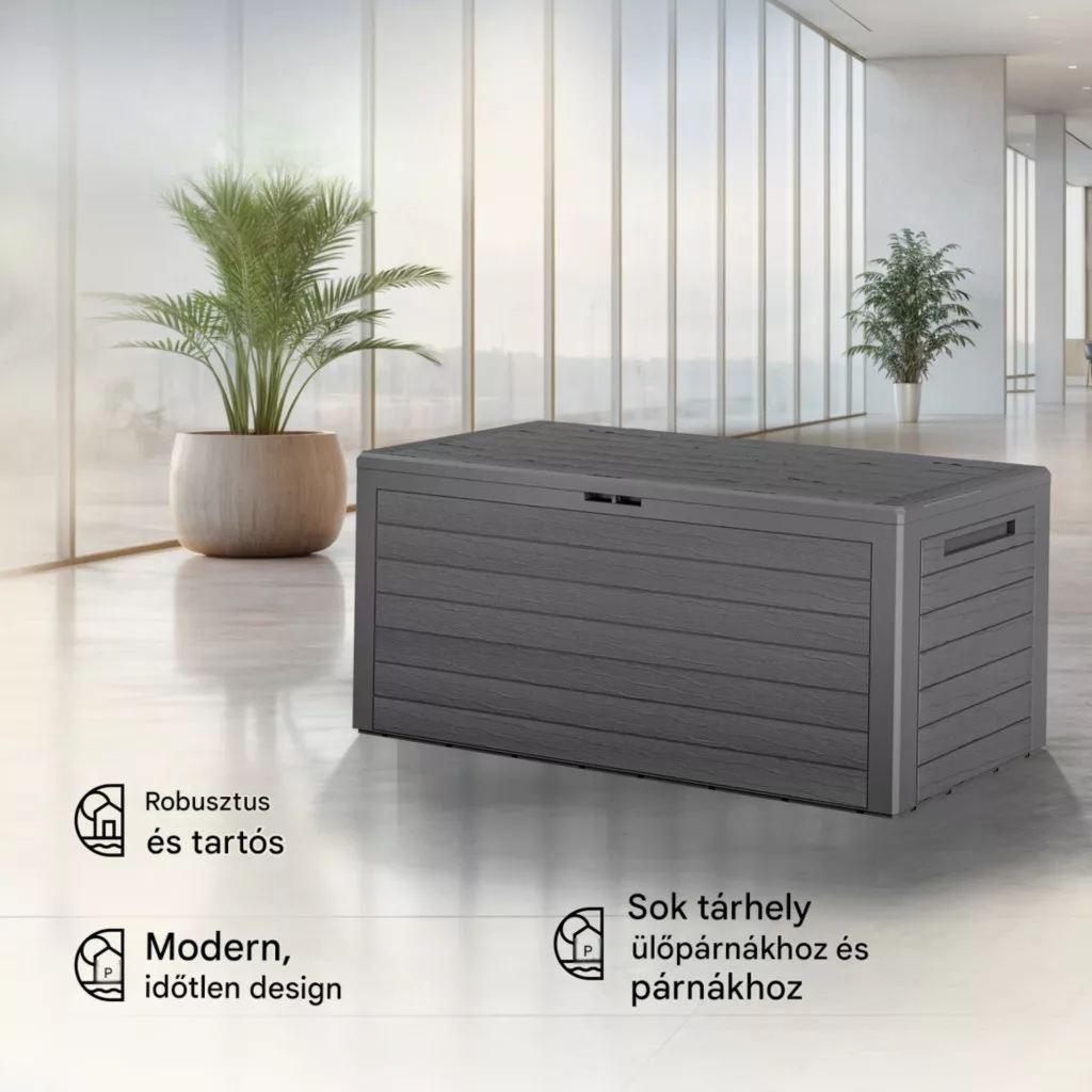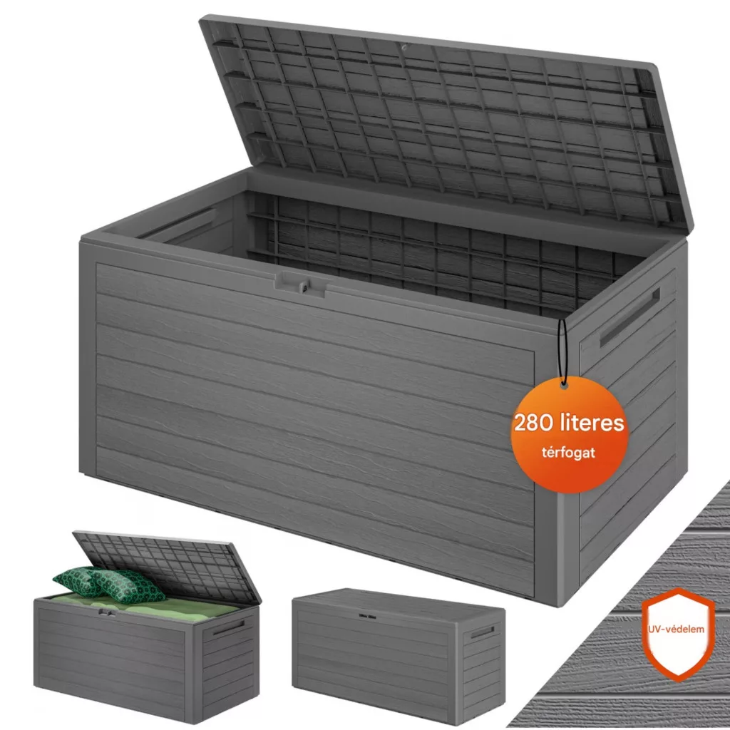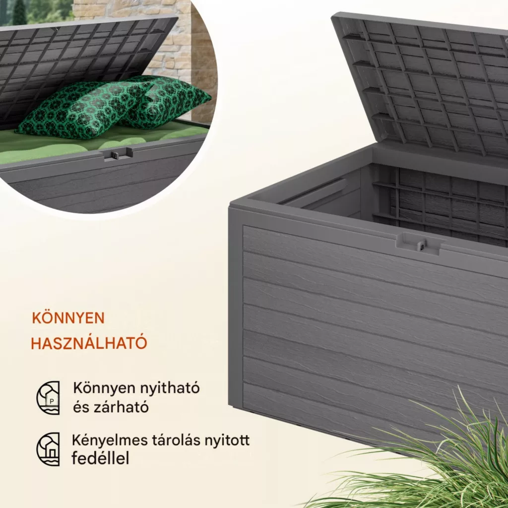 Kültéri tároló box 280 literes kerti tárolóláda szürke fahatású vízálló kivitel