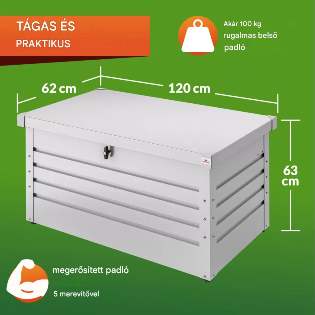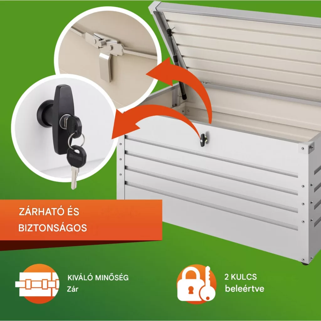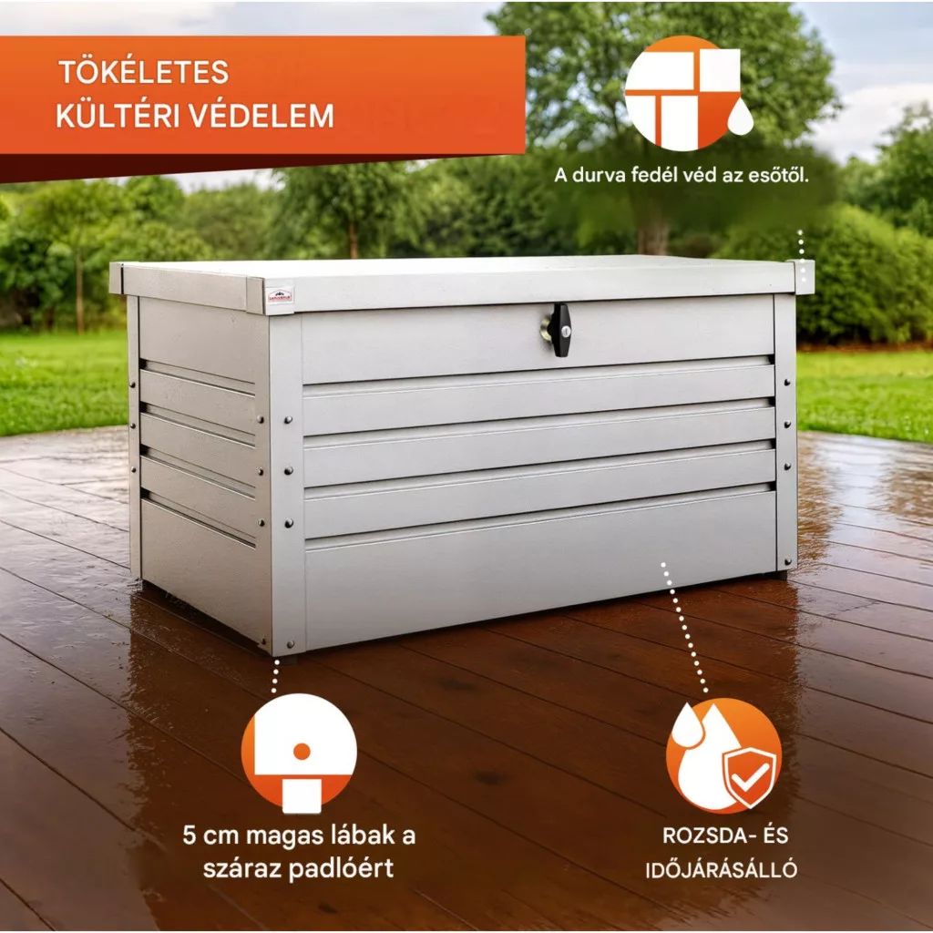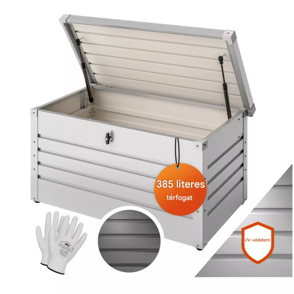 Ez a fém kerti tároló láda 385 literes kivitelben ideális választás, ha Ön maximális tartósságot és biztonságot keres. A zárható kialakítás, a nagy teherbírás és a vízálló kivitel garantálja a hosszú távú, megbízható használatot.