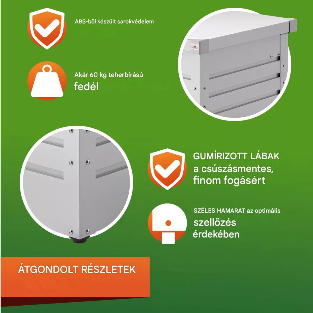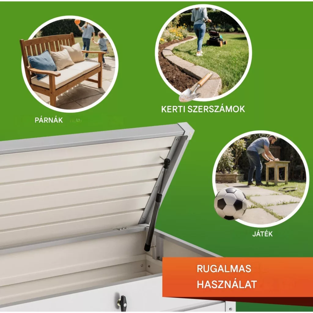A robusztus kialakítás és a nagy tárolókapacitás garantálja, hogy minden kerti eszköz és kiegészítő védett helyen legyen.