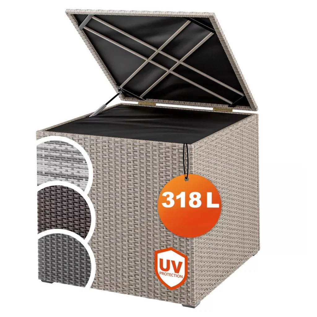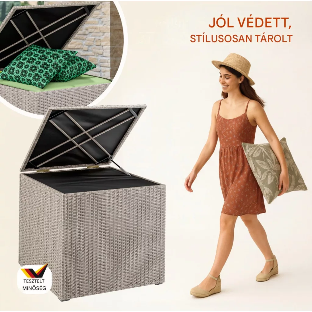 Ez a polyrattan kerti tároló láda 318 literes kivitelben ideális választás, ha Ön egy elegáns, tartós és praktikus tárolót keres. A vízálló belső bélés, a gázrugós fedél és a masszív szerkezet garantálja a kényelmes és hosszú távú használatot.