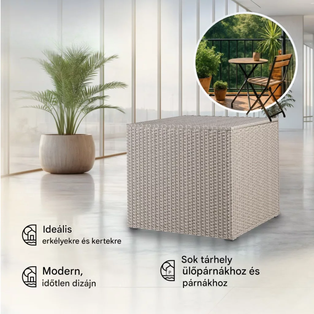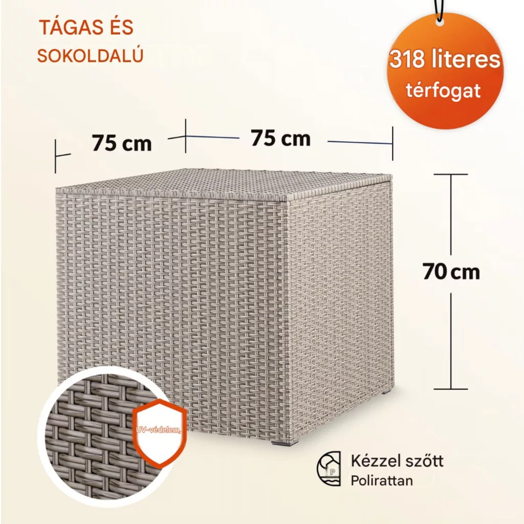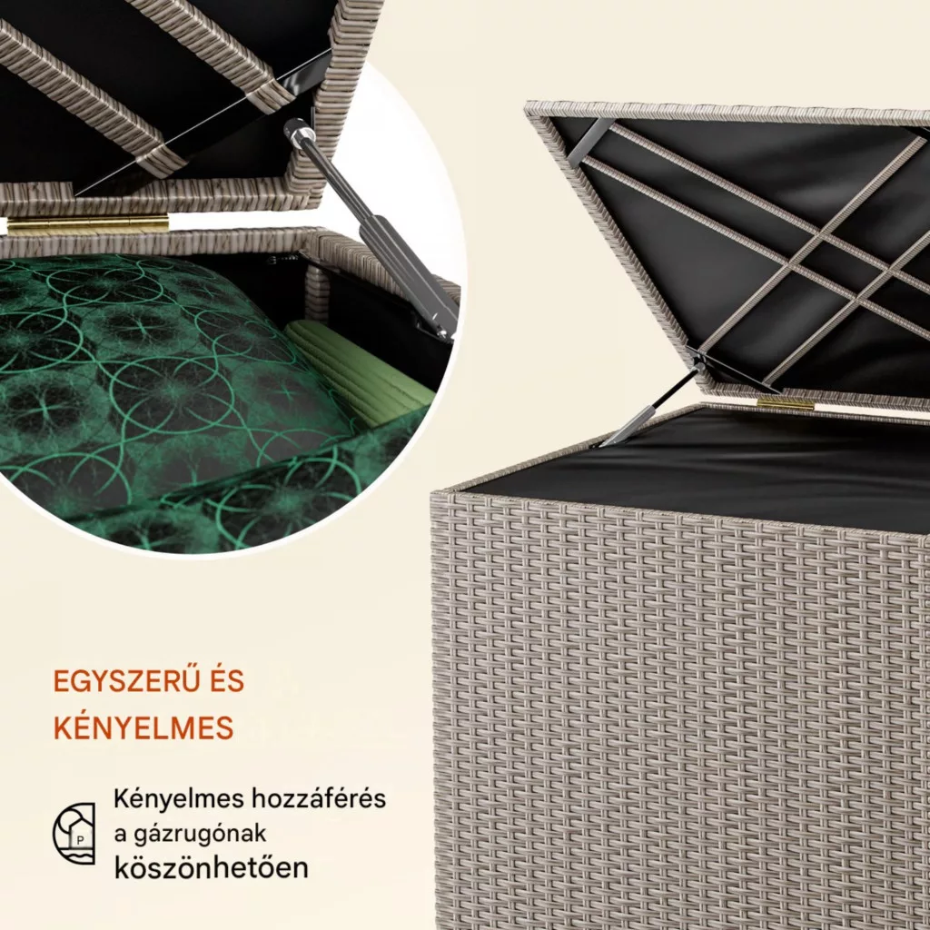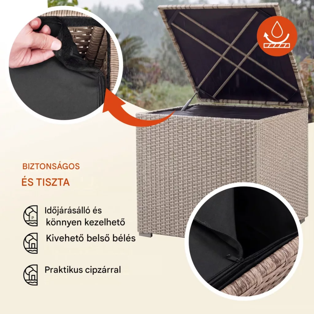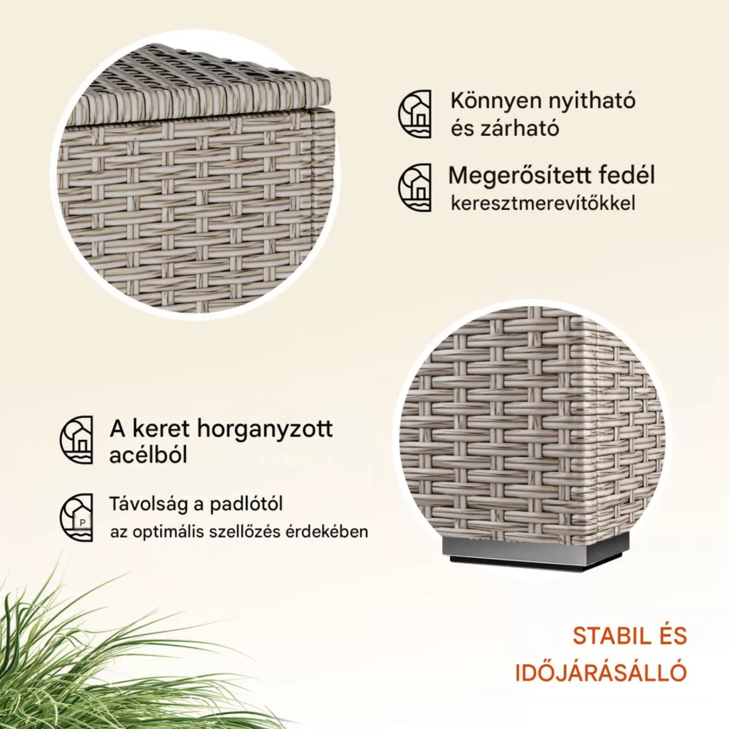 Kerti tárolóláda polirattan 318 liter krémszínű időjárásálló kültéri tároló doboz belső béléssel