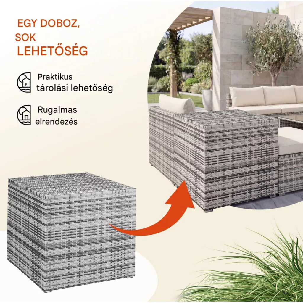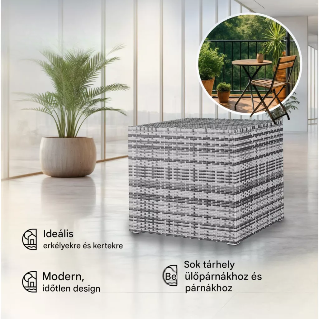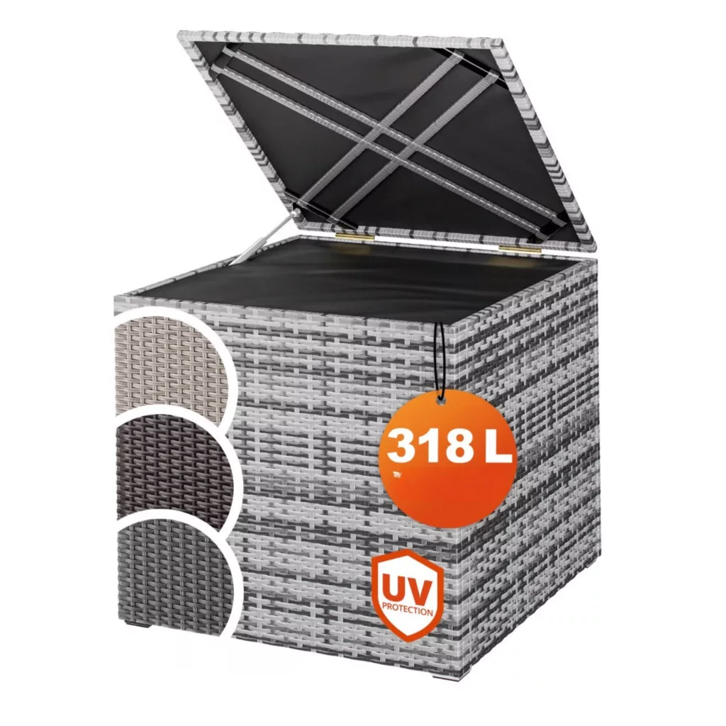 Ez a kerti tároló láda 318 literes kivitelben tökéletes választás, ha Ön egyszerre keres stílusos megjelenést és maximális funkcionalitást. A modern polyrattan kerti tároló elegáns szürke színben ideálisan illeszkedik lounge bútorokhoz, teraszhoz vagy akár erkélyhez is.