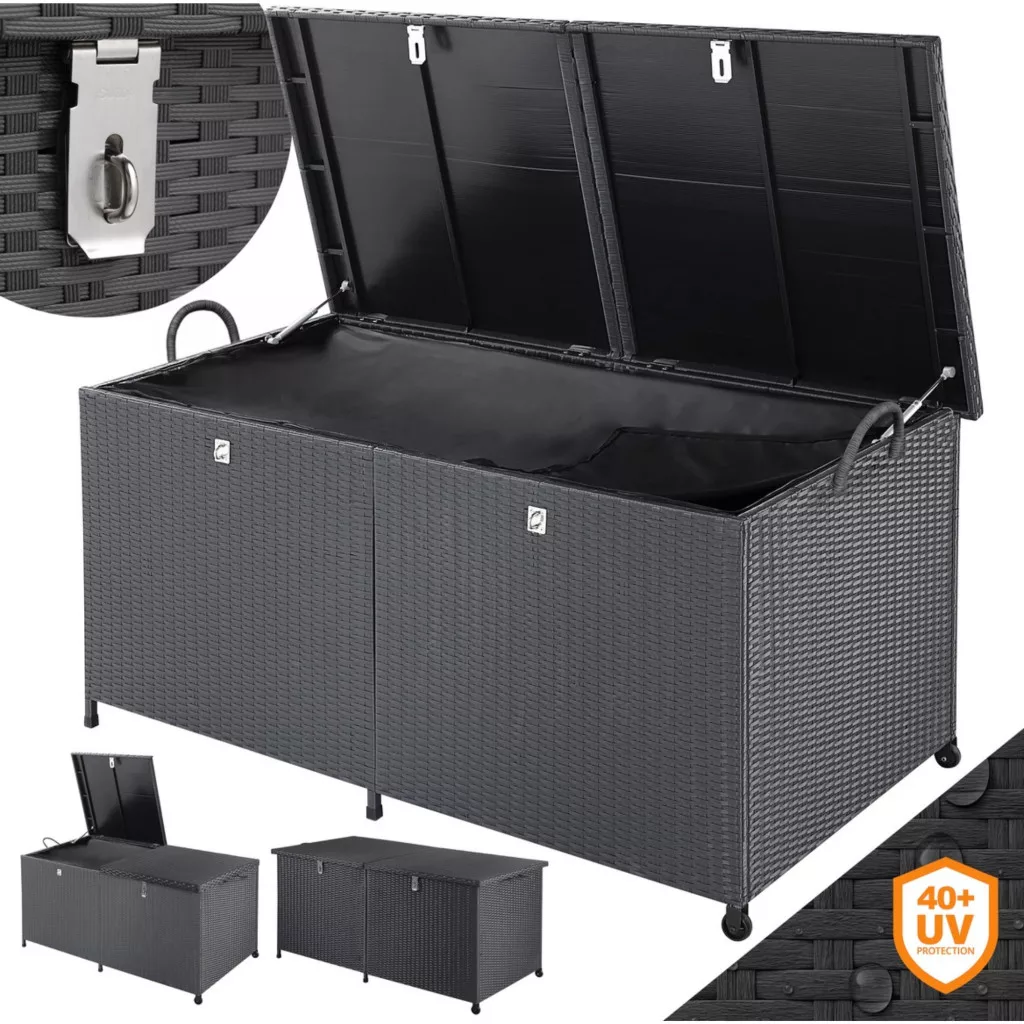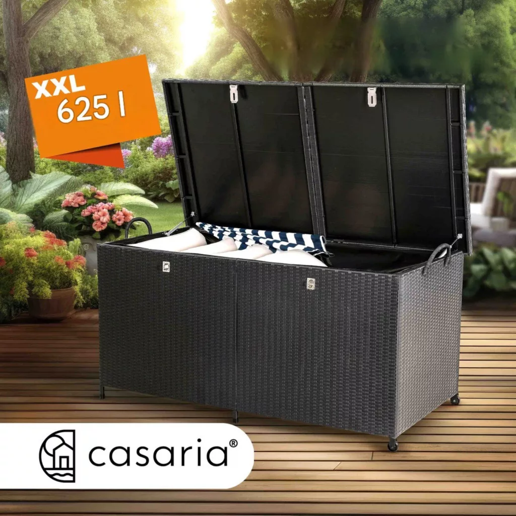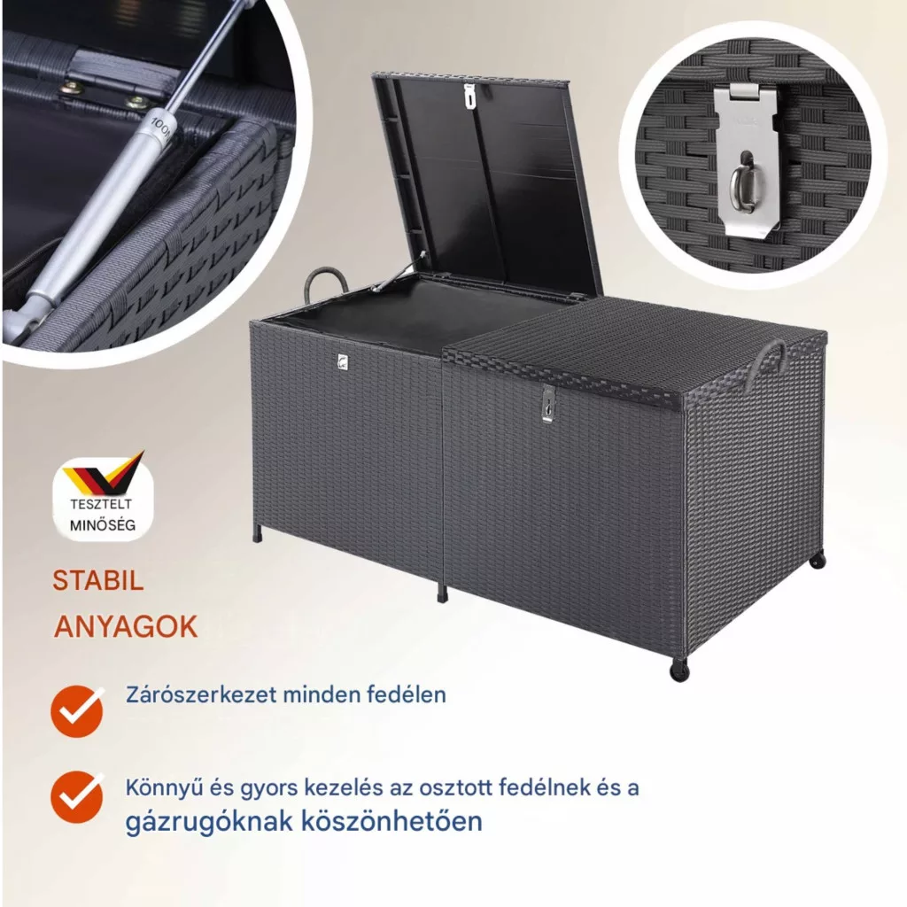 Ez a kerti tároló láda 625 literes kivitelben ideális választás, ha Ön nagy méretű, elegáns és hosszú élettartamú tárolási megoldást keres. A modern kialakítású polyrattan kerti tároló fekete színben tökéletesen illeszkedik bármilyen kültéri környezetbe – legyen szó teraszról, kertről vagy erkélyről.