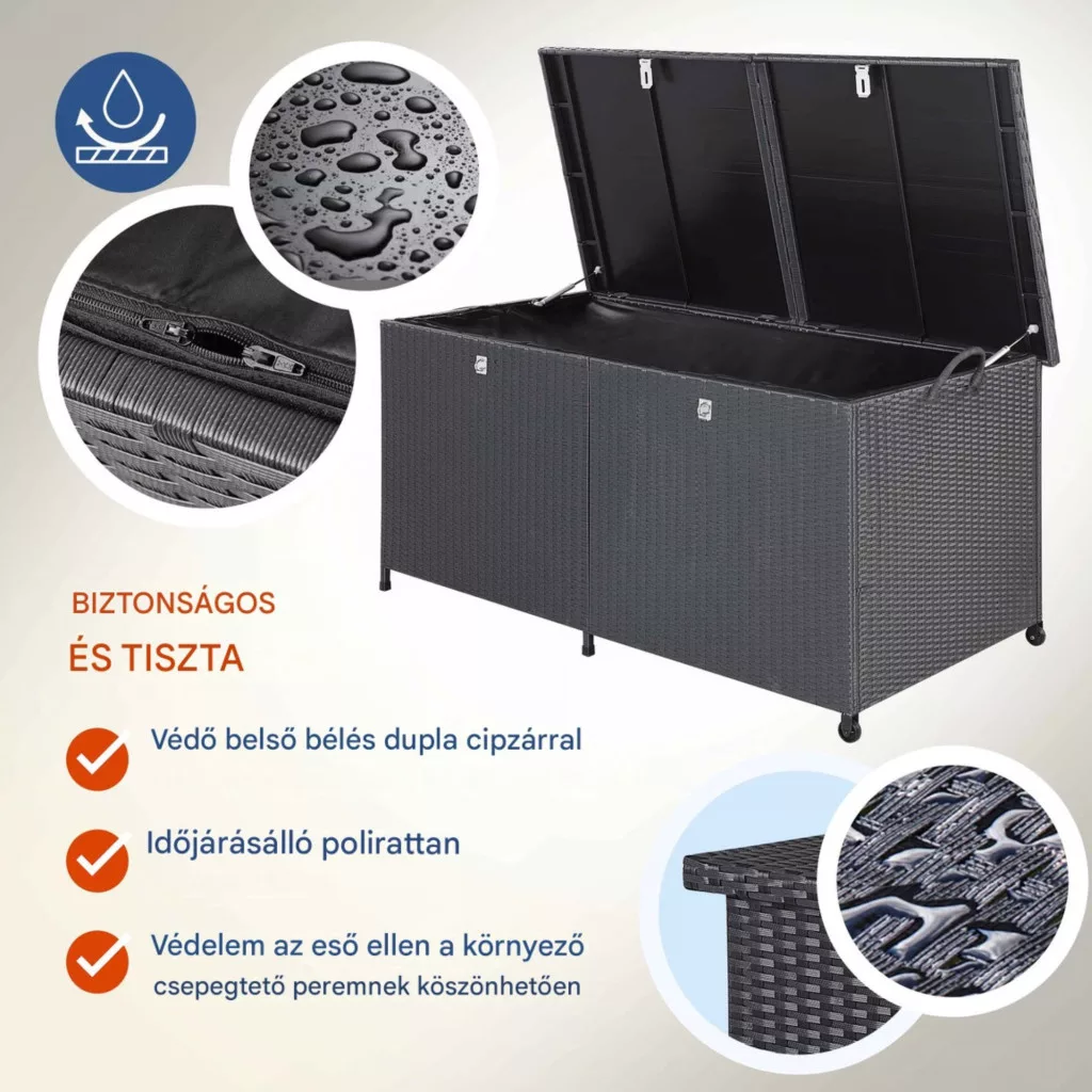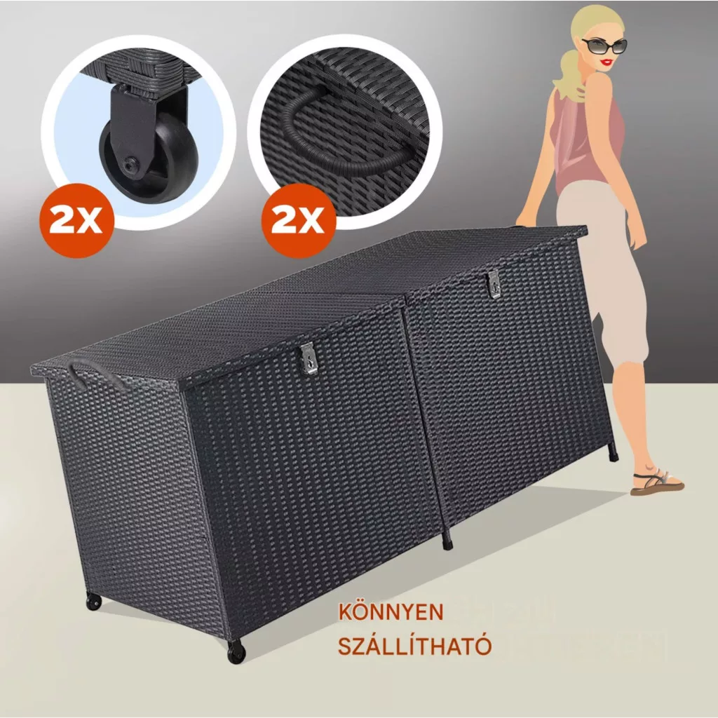 Kerti tárolóláda polirattan 625 literes időjárásálló zárható kültéri tároló kerekekkel