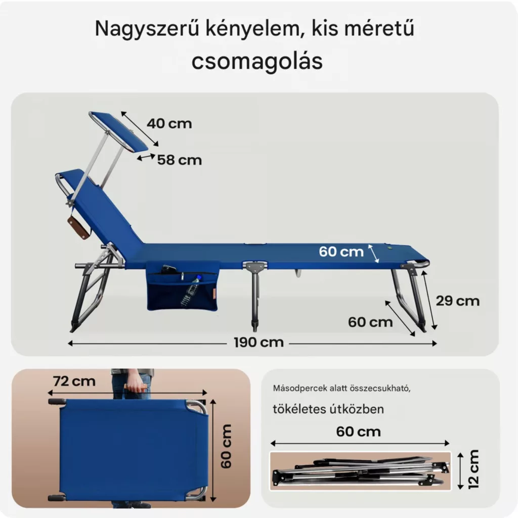 Ez az összecsukható kerti napozóágy napellenzővel ideális választás, ha Ön egy könnyű, mégis stabil és sokoldalúan használható megoldást keres. A strandszék funkció, az állítható kialakítás és a praktikus tárolórekeszek garantálják a gondtalan pihenést bárhol.