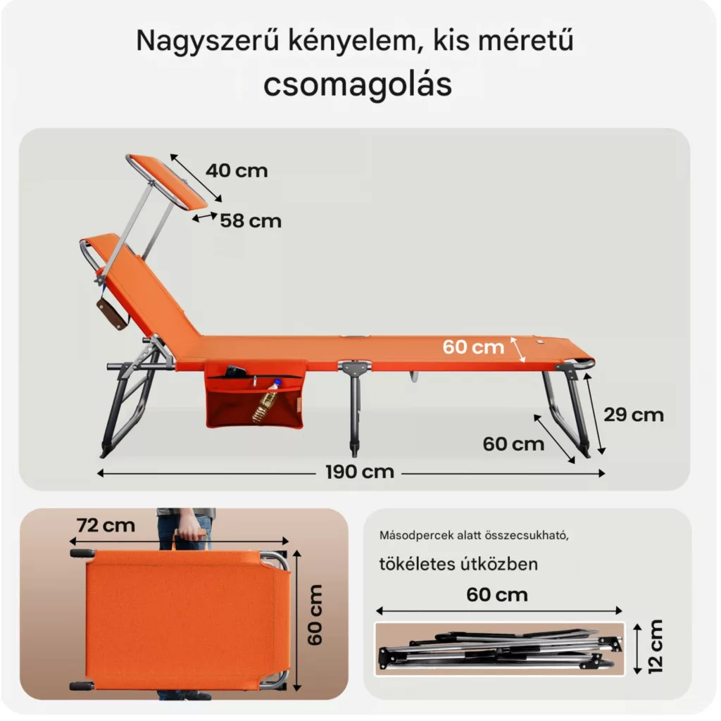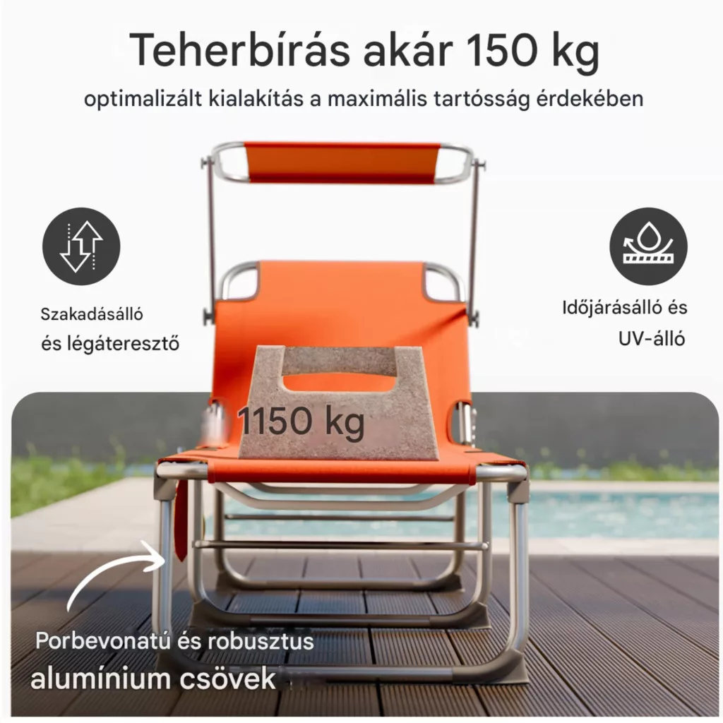 Ez a kerti napozóágy napellenzővel ideális választás, ha Ön egy könnyen hordozható, mégis stabil és kényelmes megoldást keres. Az összecsukható strandszék funkció, a praktikus tároló és az állítható kialakítás garantálja a gondtalan pihenést bárhol.