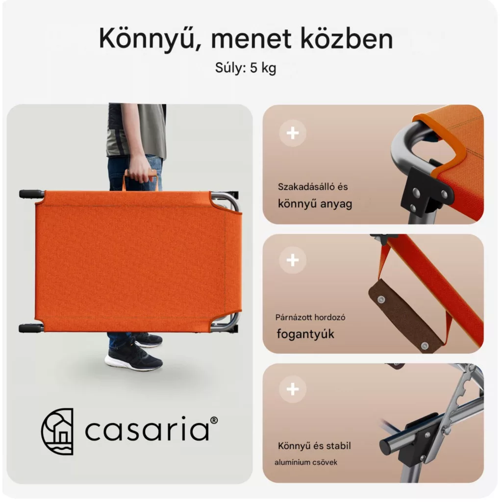 Élvezze a napsütést kompromisszumok nélkül ezzel a modern kialakítású kerti napozóágy modellel! Az Ibiza típusú, narancssárga kivitelű fekvőszék ideális választás kertbe, teraszra, strandra vagy akár kempingezéshez. A praktikus kialakításnak köszönhetően egyszerre funkcionál összecsukható nyugágyként és kényelmes napozóágyként.