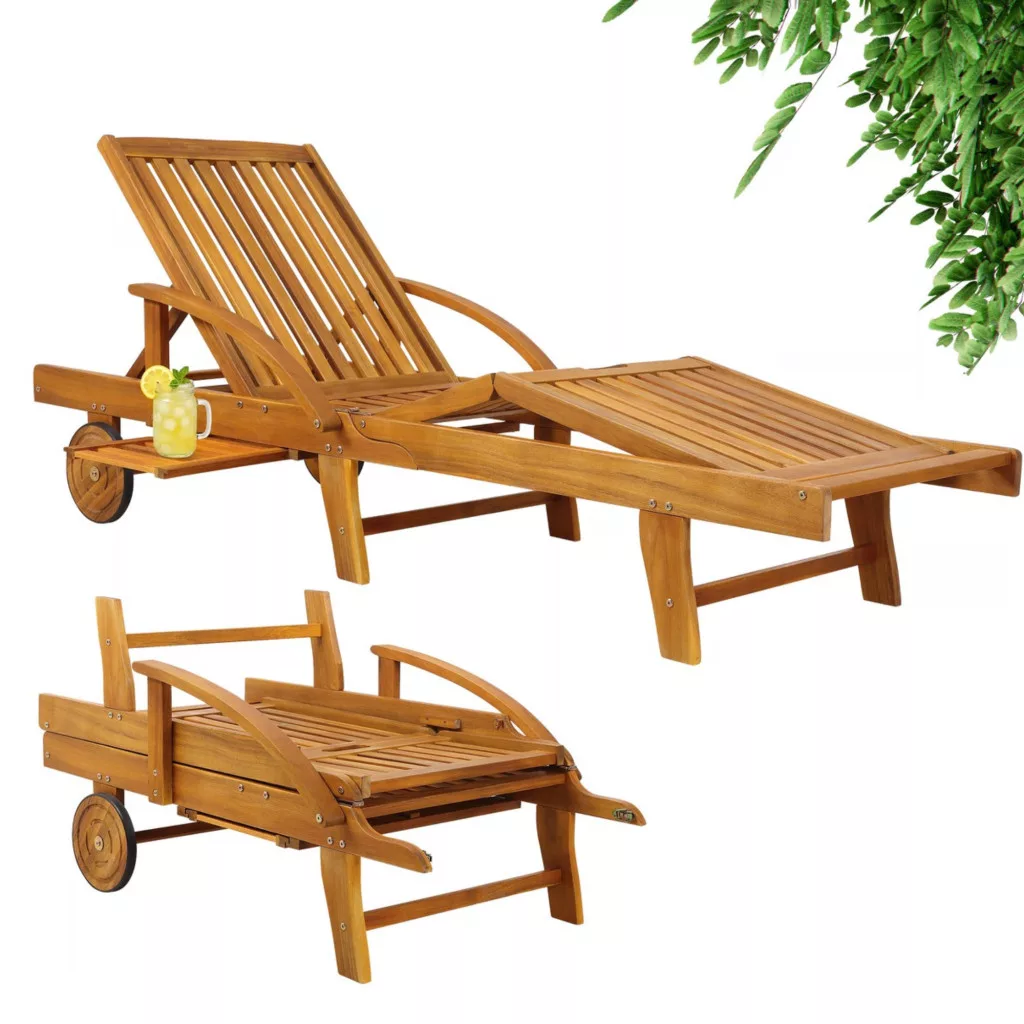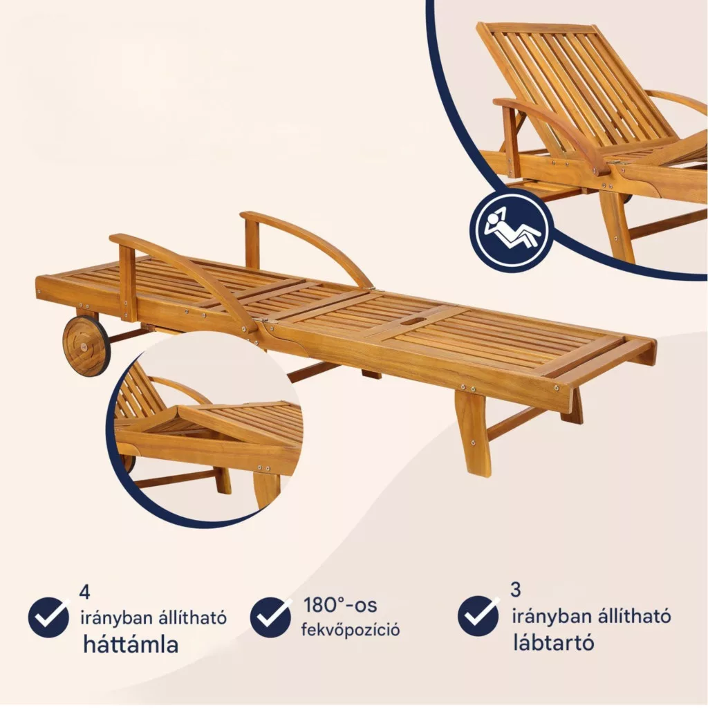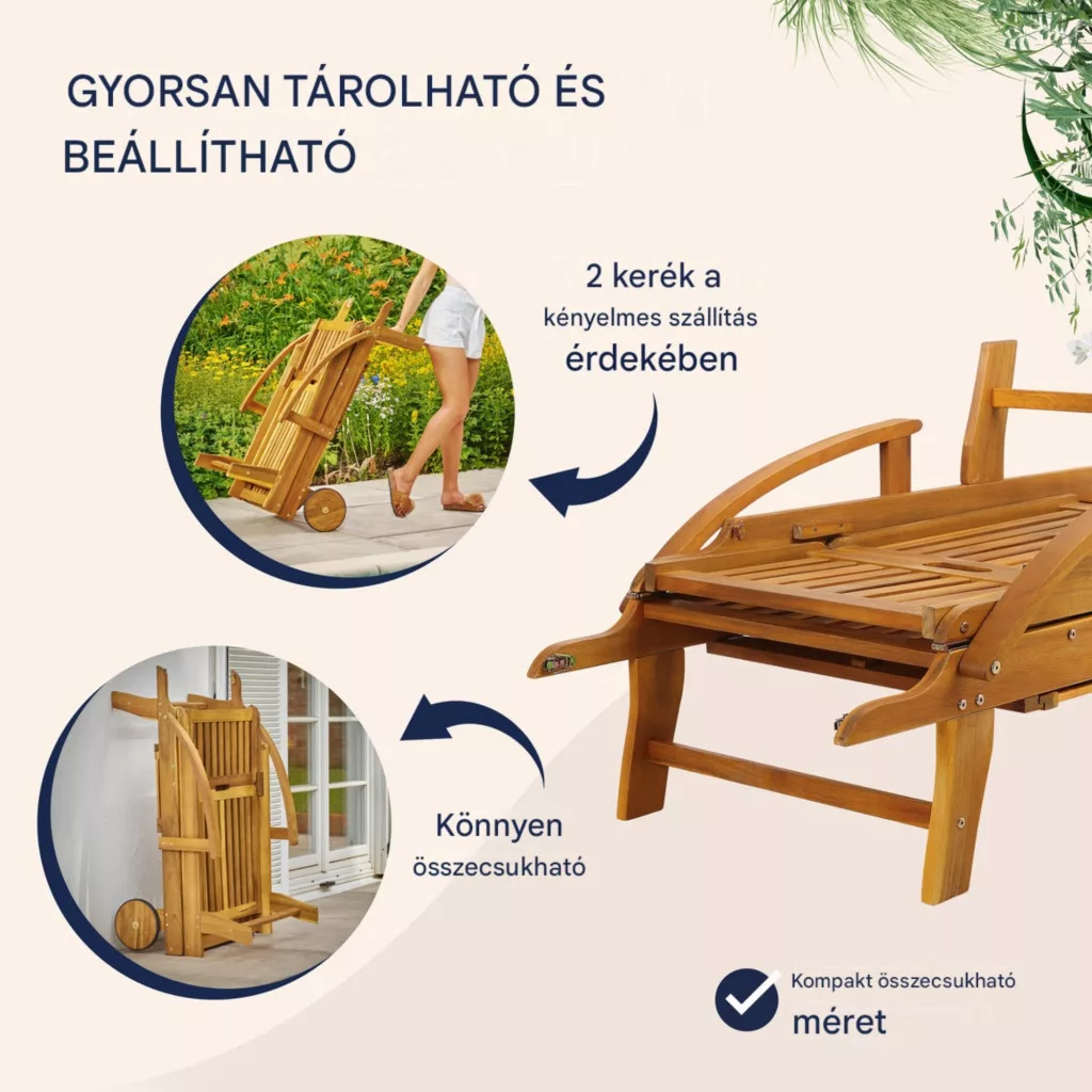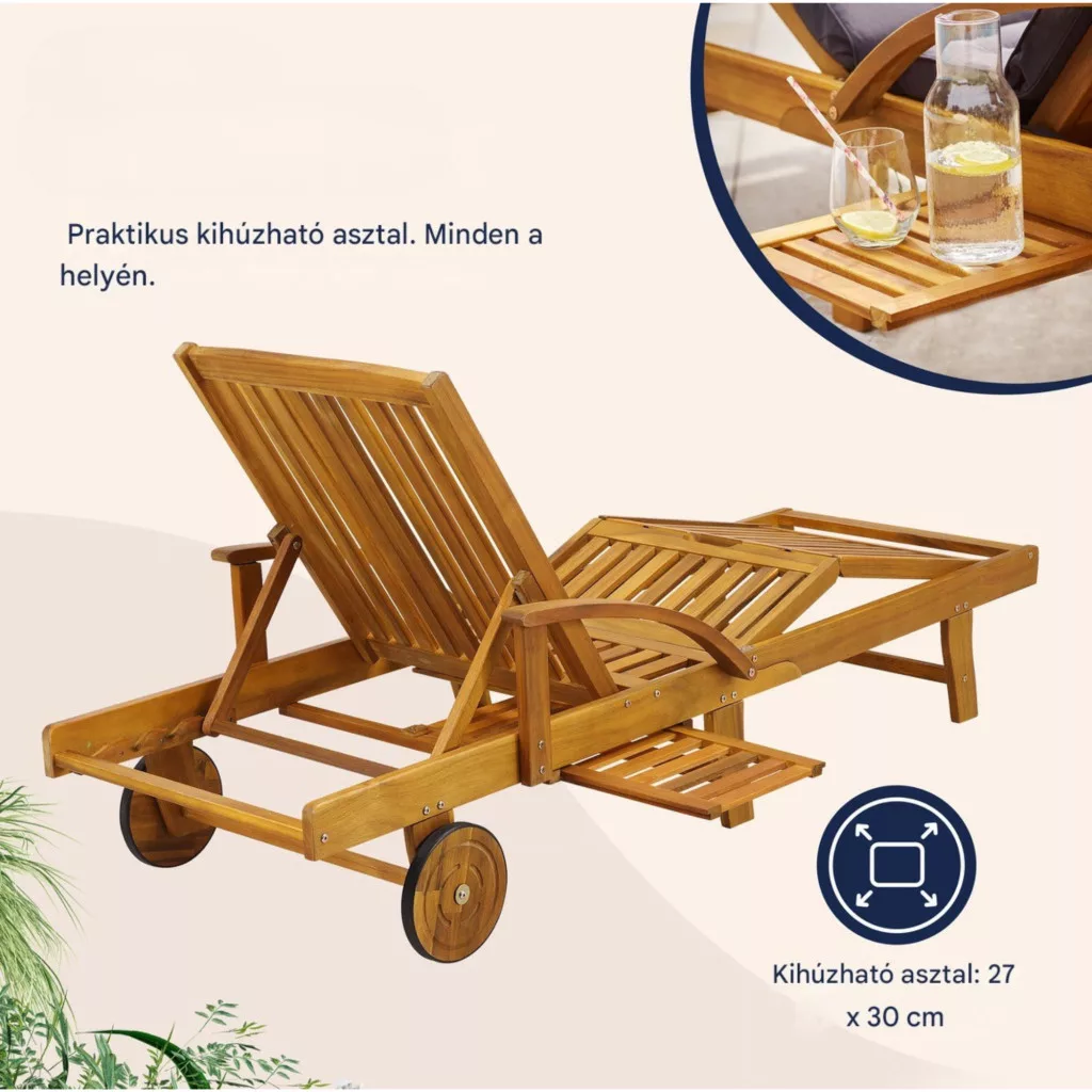 Összecsukható nyugágy állítható akácfa kerti napozóágy kihúzható asztallal és kerekekkel