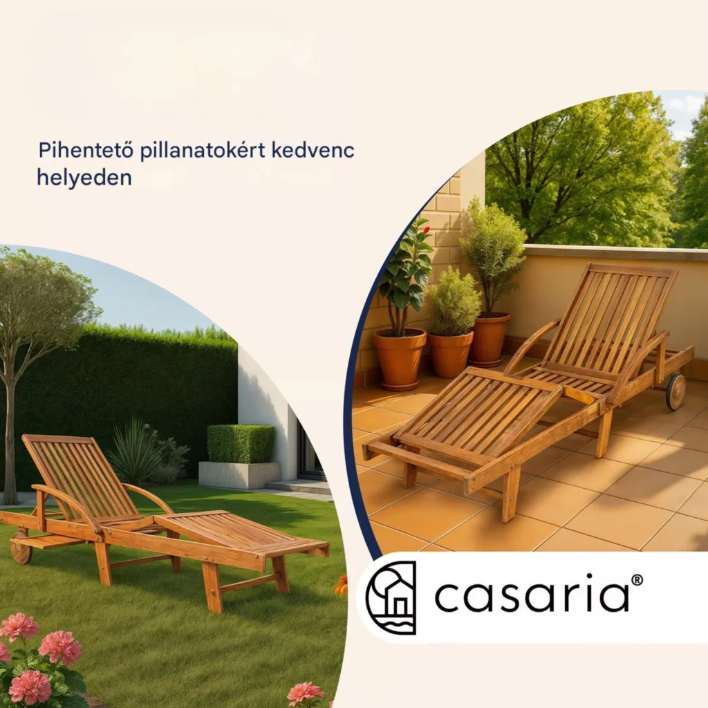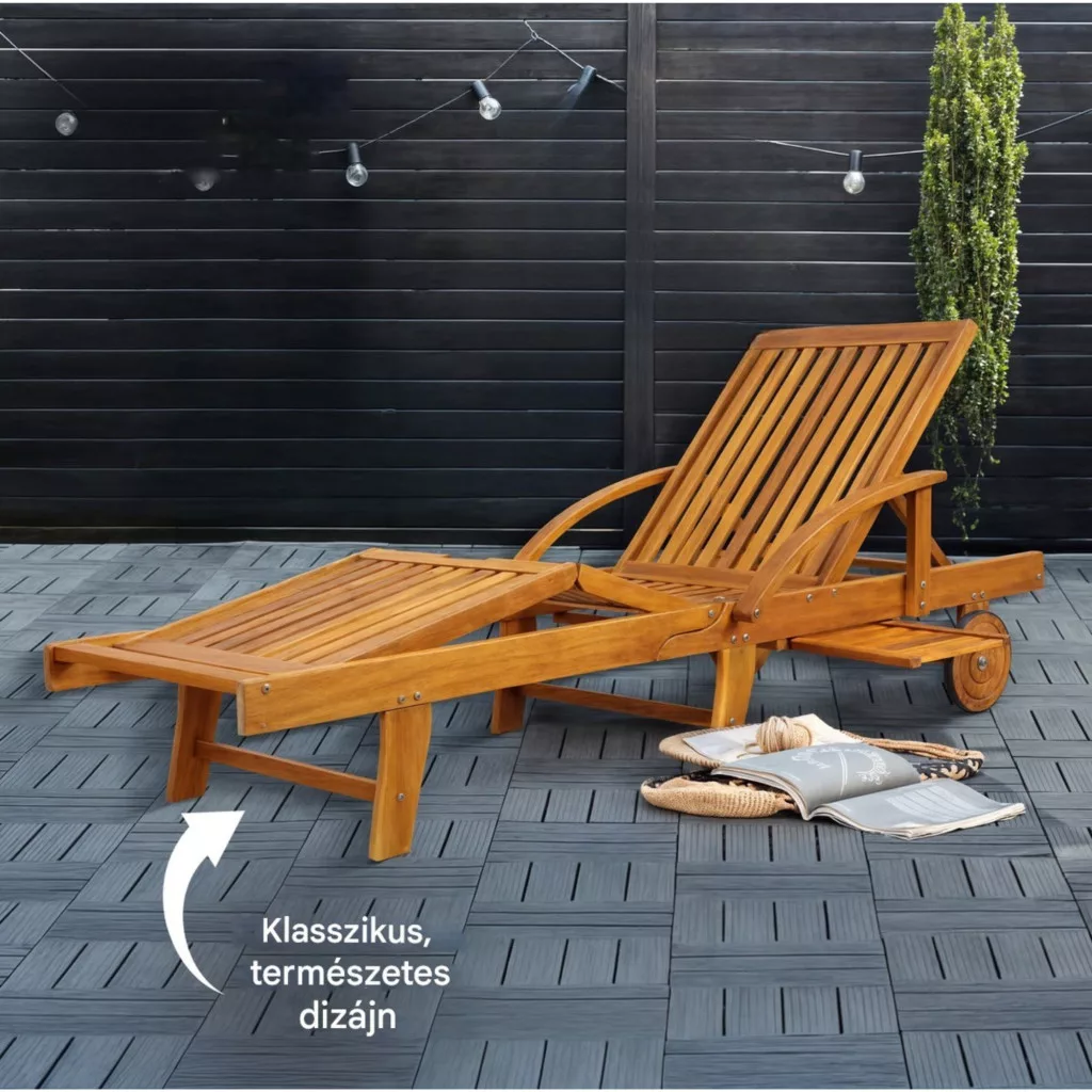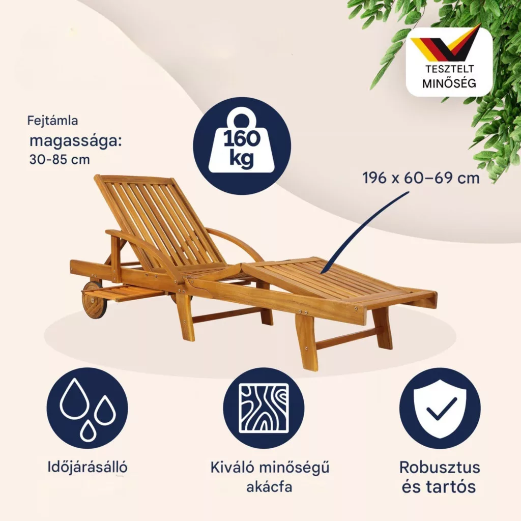 Ez a akácfa kerti napozóágy kerekekkel és asztallal ideális választás, ha Ön egy sokoldalú, kényelmes és tartós megoldást keres. Az állítható funkciók, a mobilitás és a praktikus kiegészítők együttesen biztosítják a tökéletes pihenési élményt.