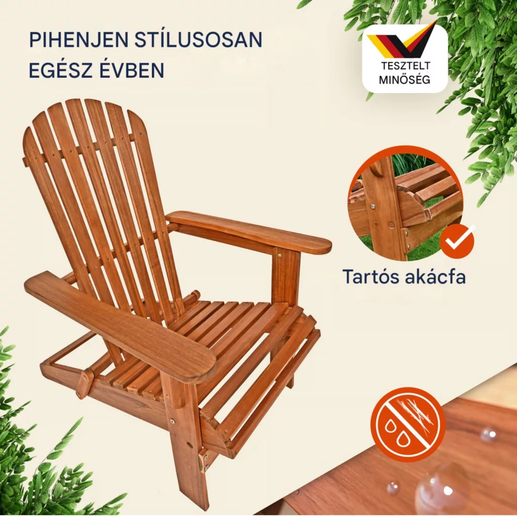 Ez a akácfa kerti pihenőszék tökéletes választás, ha Ön kényelmes és esztétikus ülőalkalmatosságot keres kültéri használatra. A természetes fa megjelenés harmonikusan illeszkedik bármilyen kertbe, teraszra vagy erkélyre, miközben a kialakítás a maximális relaxációt szolgálja.