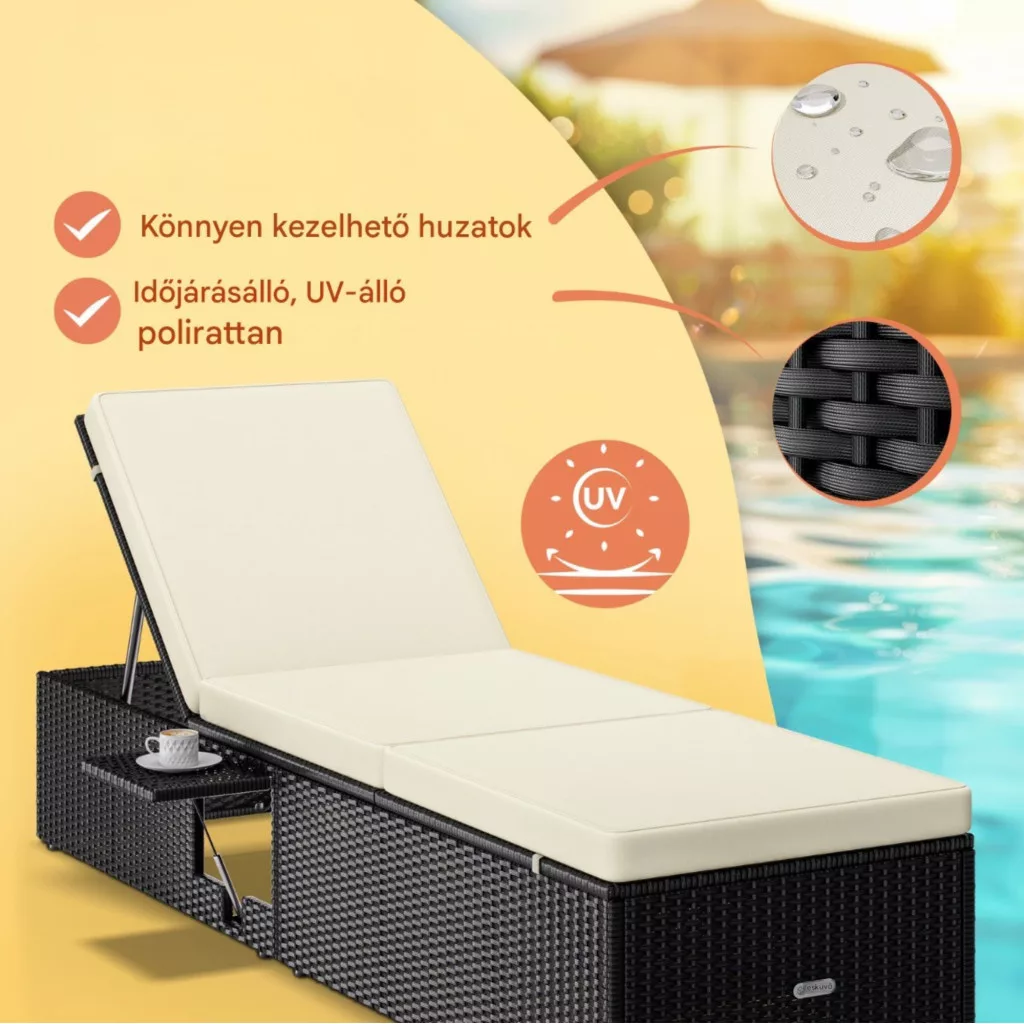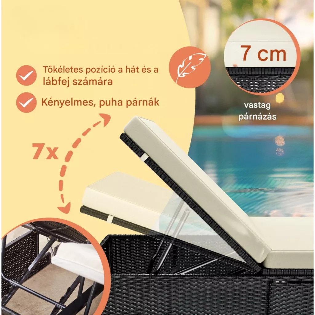 Polyrattan kerti napozóágy 200x58x33cm fekete/krém kültéri nyugágy