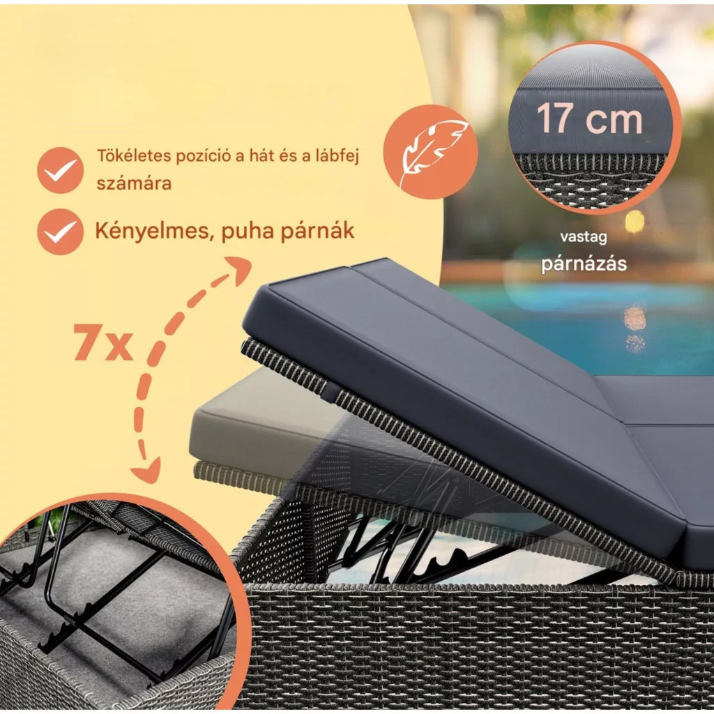 Ez az XXL polyrattan kerti napozóágy ideális választás, ha Ön a maximális kényelmet és extra méretet keresi. A nagy fekvőfelület, az állítható kialakítás és a praktikus asztalok garantálják a tökéletes pihenést.