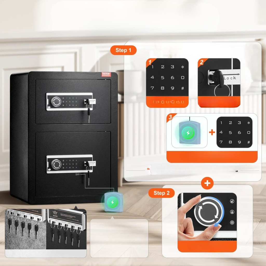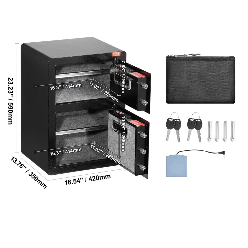 Ez a kétszárnyú, kb. 99 literes digitális széf praktikus, masszív és jól rendszerezhető megoldást kínál értéktárgyai biztonságos tárolására.