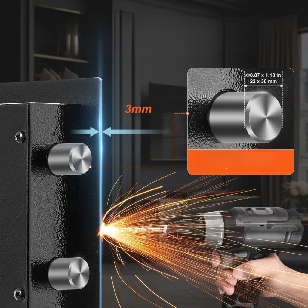 A széf hátoldalán és alján 4–4 előfúrt rögzítőnyílás található, a csomag tartalmazza a rögzítéshez szükséges csavarokat. Falhoz vagy padlóhoz rögzíthető a még nagyobb biztonság érdekében.