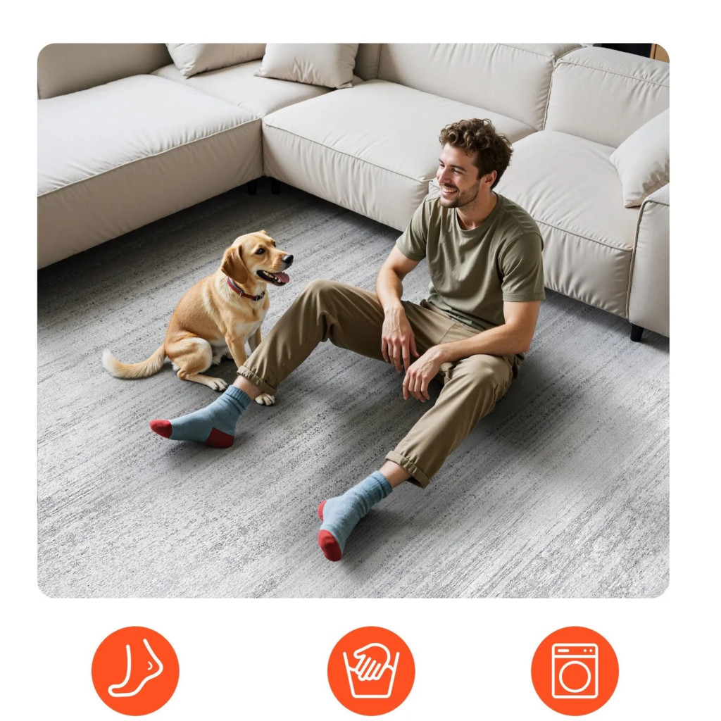 A szőnyeg finom tapintású, műkasmir hatású szálai különösen kellemes érzetet nyújtanak, mintha egy puha takarón lépne végig. A sűrű szövésű, hipoallergén kialakítás csökkenti a szöszösödést, így a szőnyeg hosszú távon is megőrzi esztétikus megjelenését.