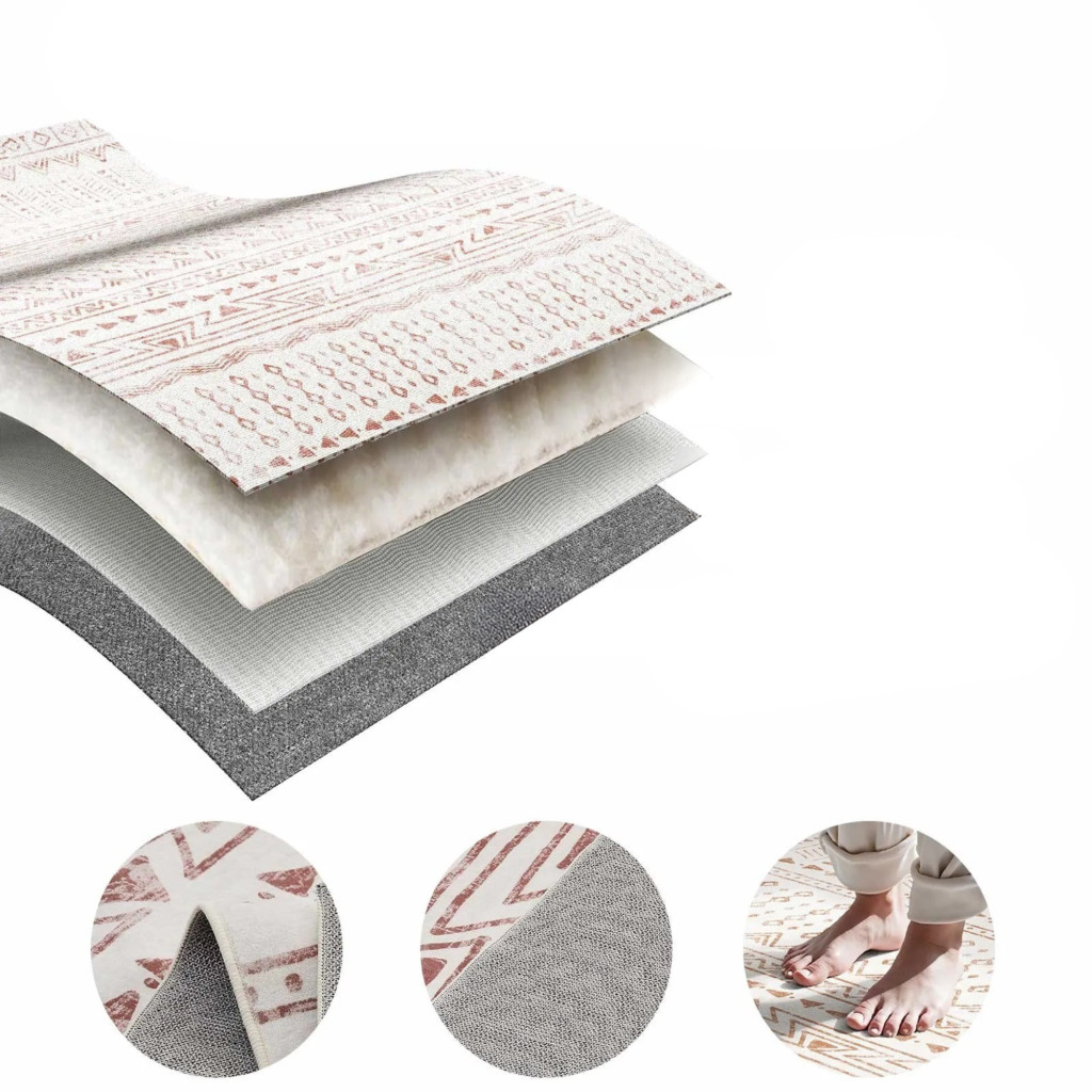 A csúszásmentes TPR hátoldal stabil tapadást biztosít parkettán, járólapon és laminált padlón is, csökkentve az elcsúszás kockázatát. A szélek laposan felfekszenek, nem pöndörödnek fel.