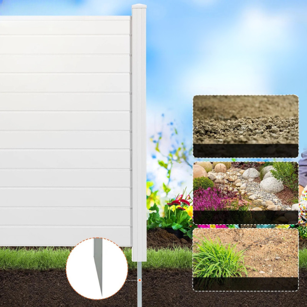 A csomagban található horganyzott fém leszúrók lehetővé teszik a gyors telepítést külön földmunka nélkül. A kb. 70 cm hosszú fém rögzítőelemek mélyen a talajba kerülnek, így a takarófal stabil marad földön, kavicson vagy homokon is.