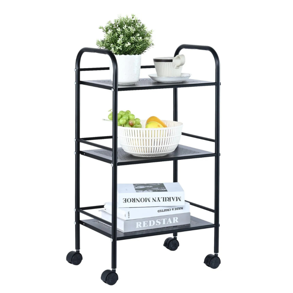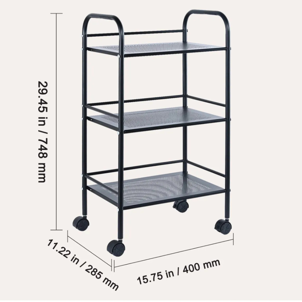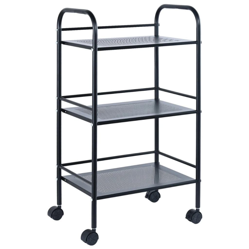 3 szintes acél gurulós tárolókocsi fekete 90 kg teherbírású 400x285x748 mm konyhai tálalókocsi