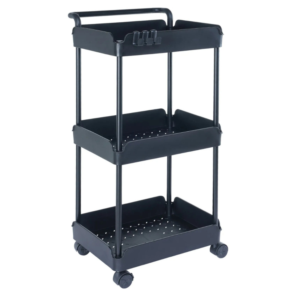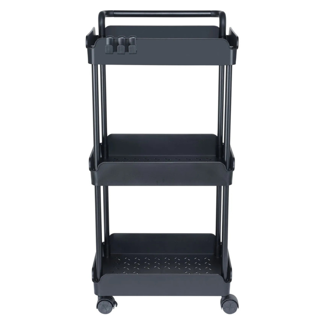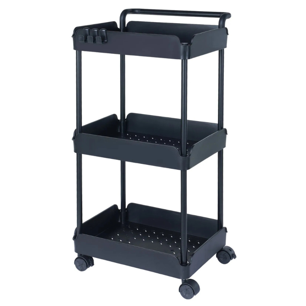 3 szintes gurulós tárolókocsi fekete, 45 kg teherbírással konyhai kocsi 370x355x761 mm tálalókocsi