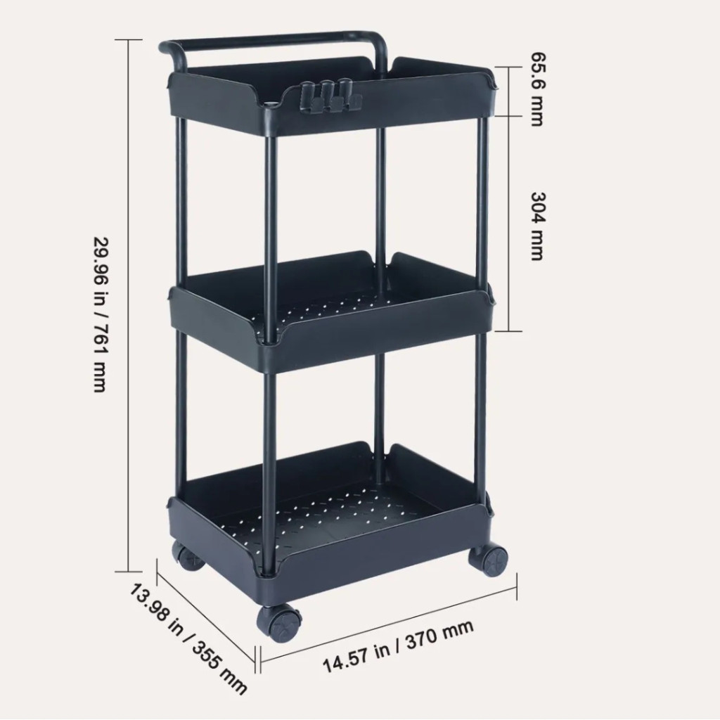 A kocsi 370 × 355 × 761 mm méretű, így szinte bármelyik szűkebb helyre is befér. Három kosárpolcának köszönhetően könnyedén rendszerezheti a konyhai eszközöket, tisztítószereket, irodai kiegészítőket vagy akár fürdőszobai piperecikkeket. Az oldalsó akasztóhorgok extra tárolási lehetőséget biztosítanak.