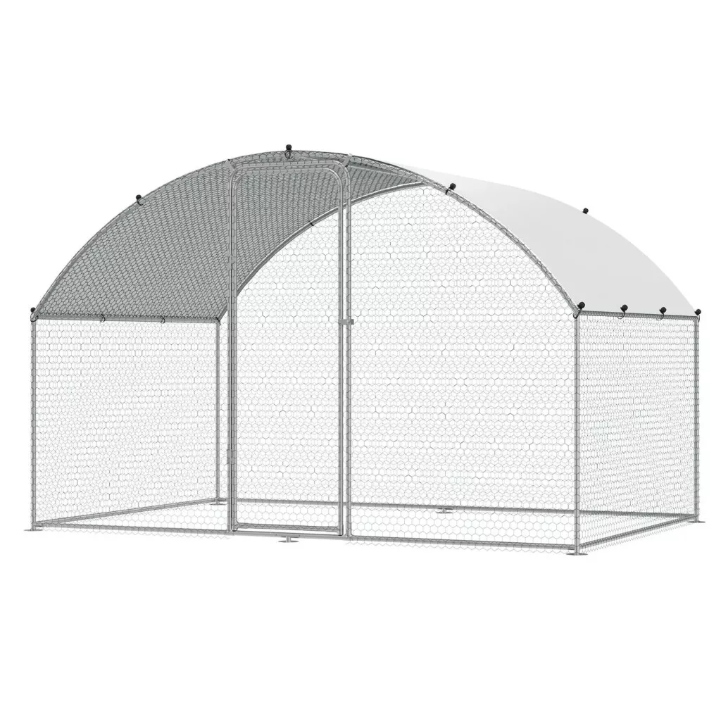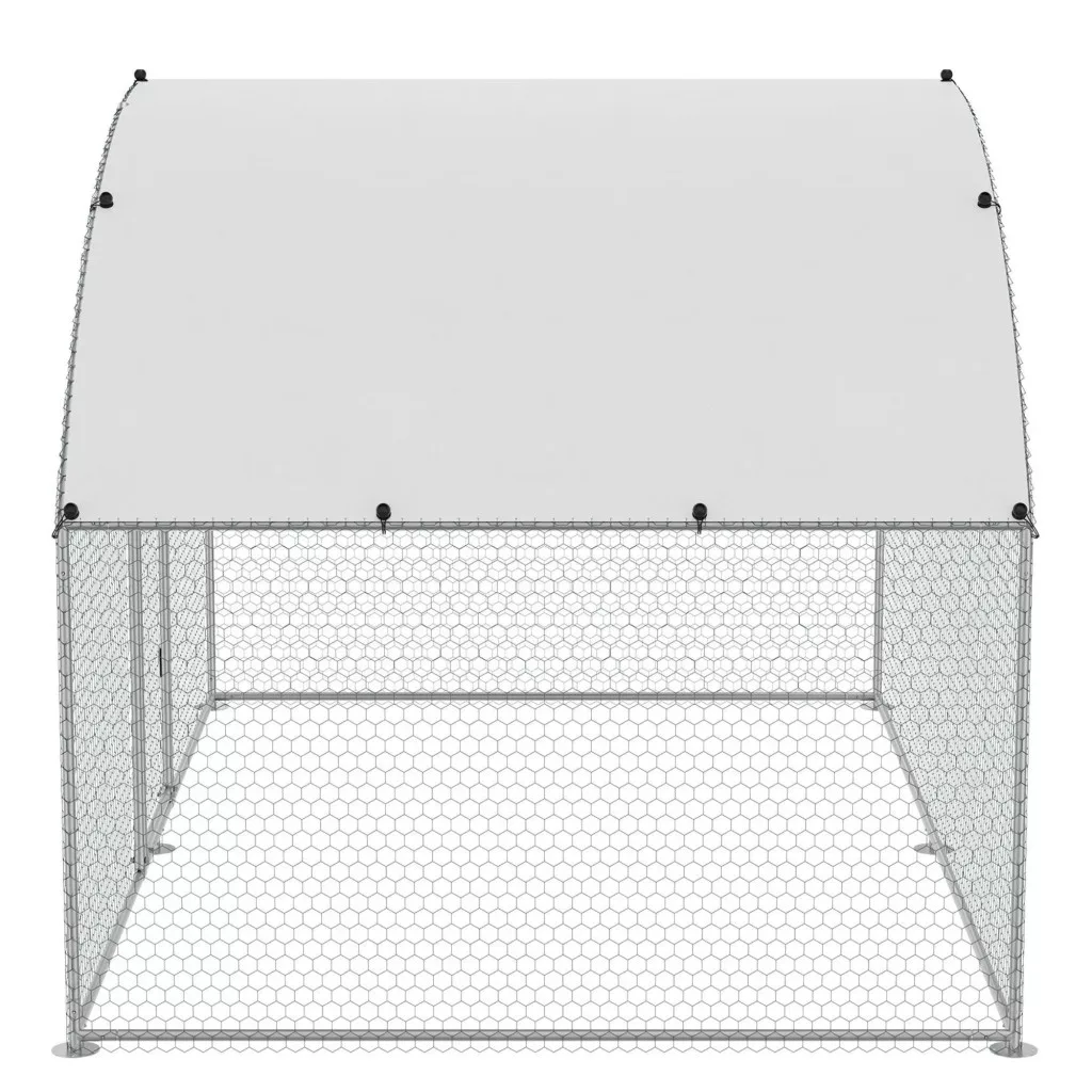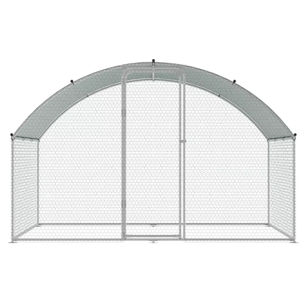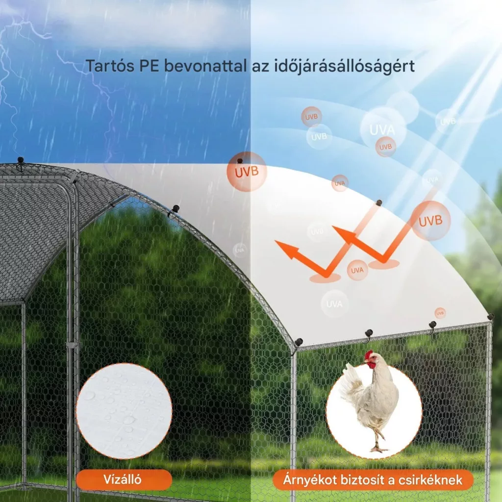 Ez a baromfi kifutó tetővel horganyzott acélcsövekből készült, amelyek ellenállnak az esőnek, szélnek és UV-sugárzásnak. A korrózióálló kialakítás hosszú távú használatot biztosít kültéri környezetben.