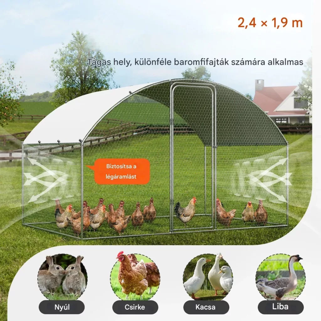 Ez a kültéri baromfi kifutó nemcsak csirkékhez, hanem kacsákhoz, fürjekhez, nyulakhoz és egyéb kisállatokhoz is ideális.