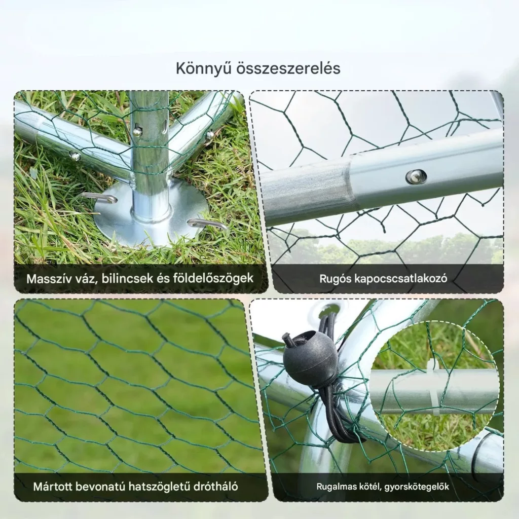 Az erős acélvázas konstrukció és a precíz hegesztések garantálják a stabilitást. A hatszögletű védőháló hatékony védelmet nyújt ragadozókkal szemben, míg a tető kialakítása biztosítja a víz megfelelő elvezetését.