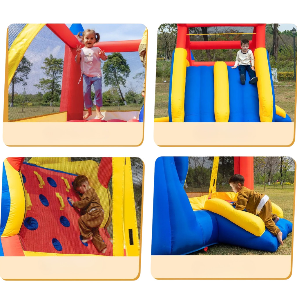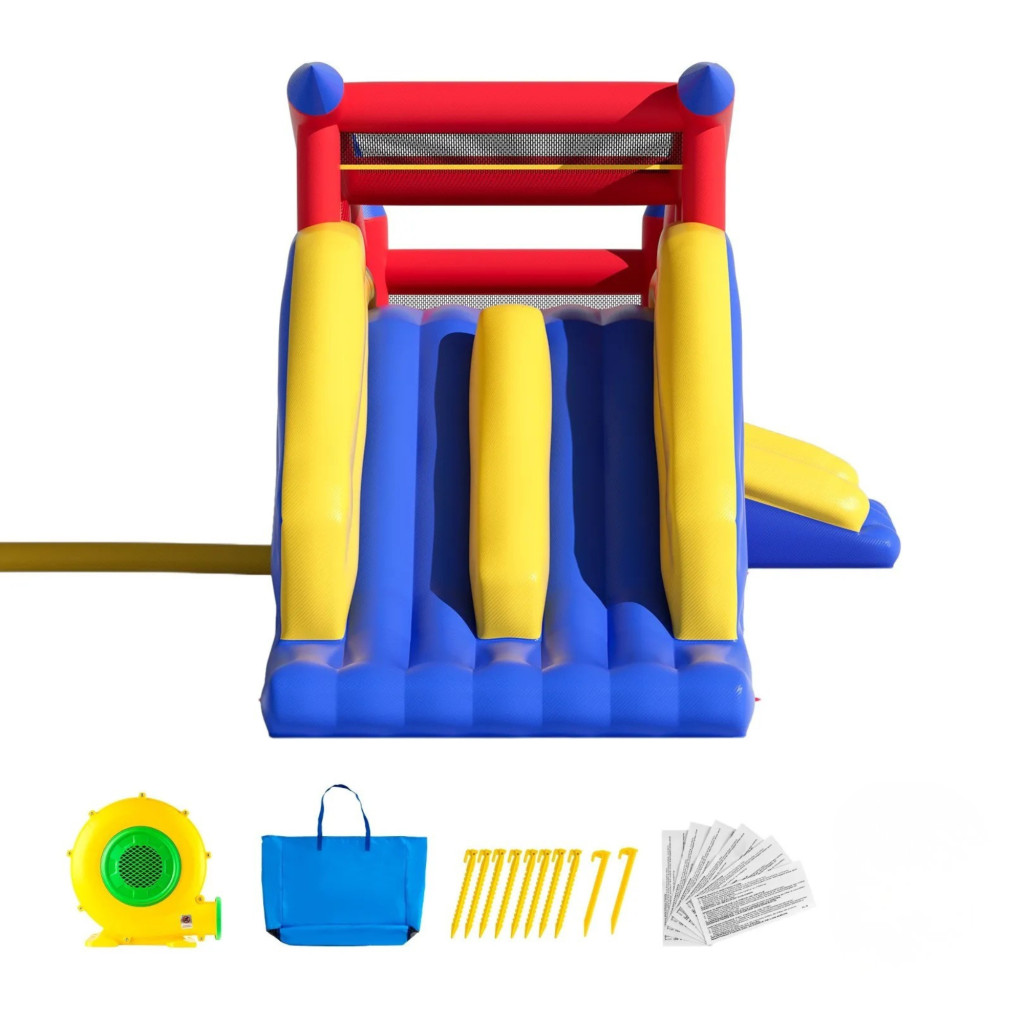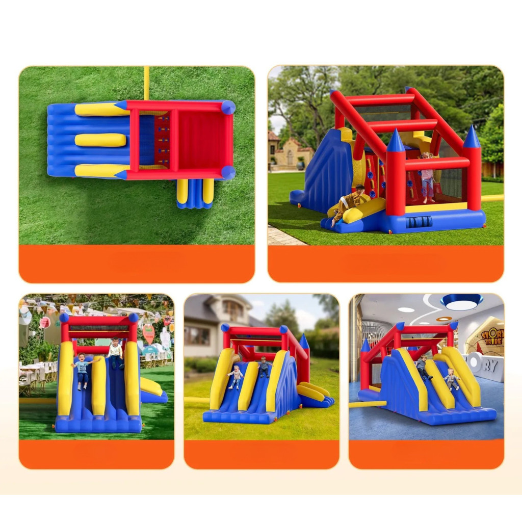 Ez a felfújható ugrálóvár dupla csúszdával tökéletes választás a gyerekek aktív szórakozásához a kertben. A nagy méretű kerti ugrálóvár gyerekeknek tágas ugrálófelületet és két párhuzamos csúszdát kínál, így egyszerre több gyermek is élvezheti a játékot.
