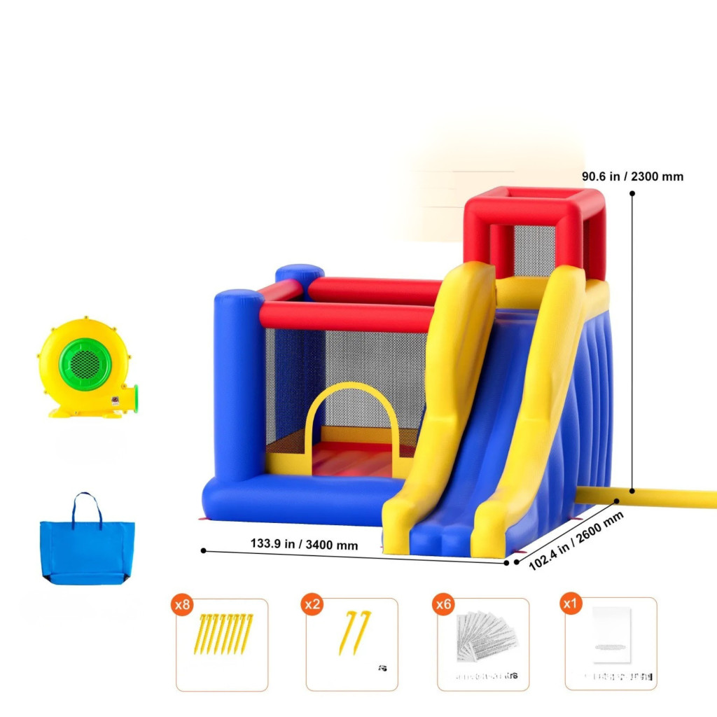 A 340 × 260 × 230 cm méretű ugrálóvár strapabíró anyagból készült, így ideális családi kertekbe, születésnapi bulikra vagy kerti rendezvényekre.