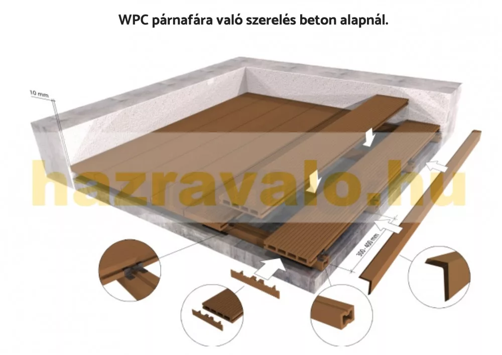 WoodLook termék. A párnafához rögzítő fülekkel kell rögzítheti a WPC-t.