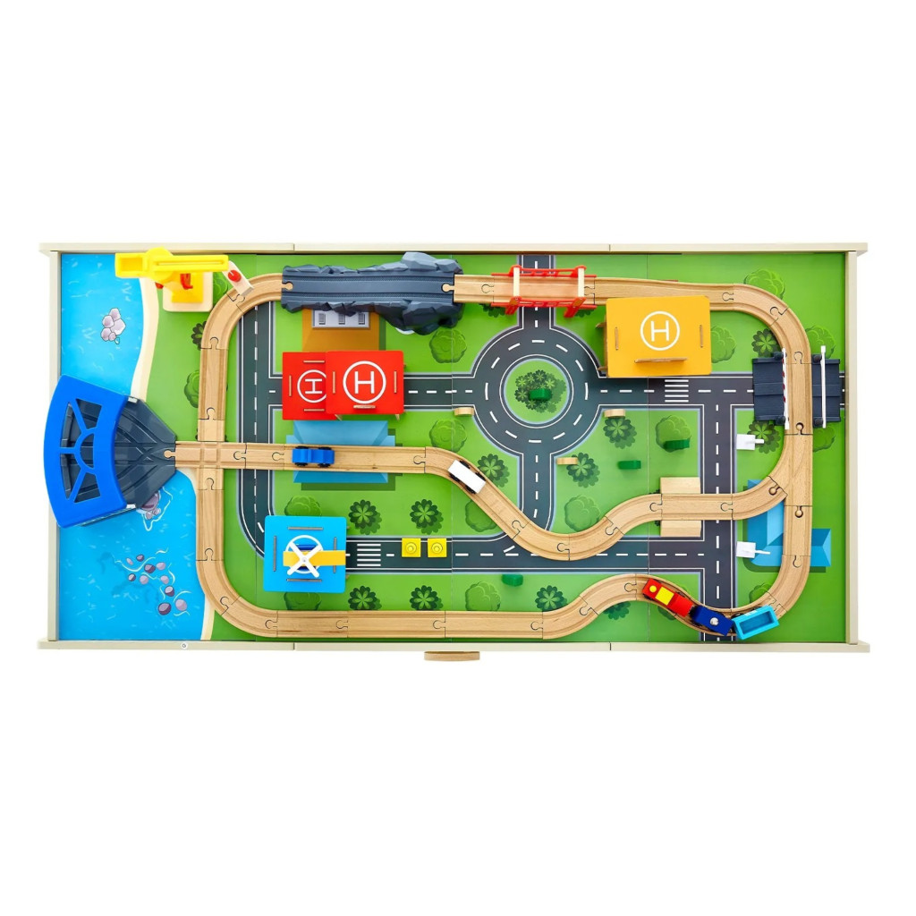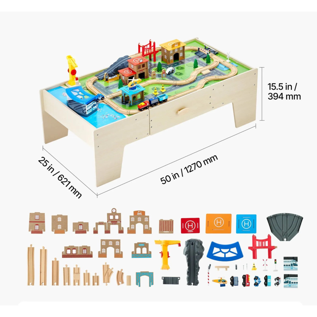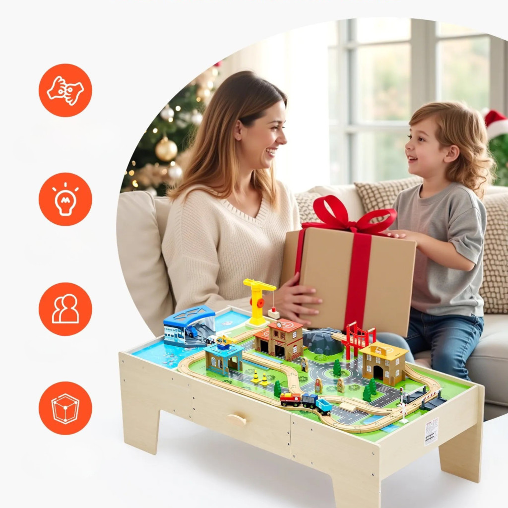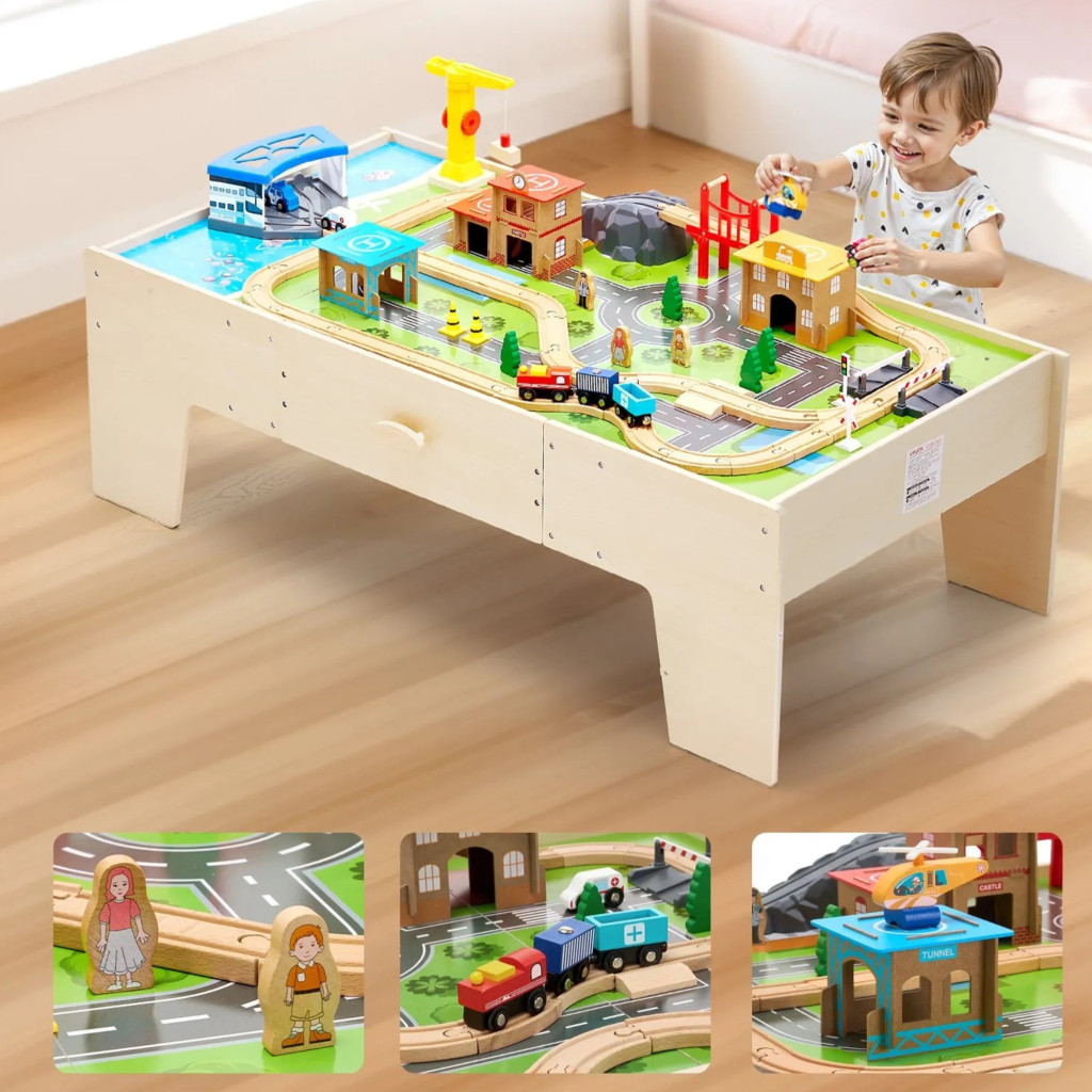 Fa gyerek játékasztal 62 darabos szett játszóasztal nagy fiókkal, 3 az 1-ben vonatkészlet kreatív játékkészlet 3 éves kortól