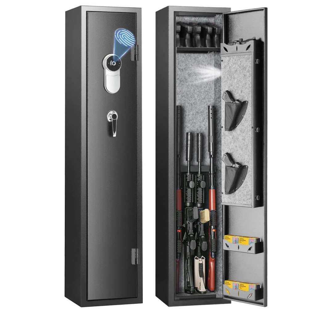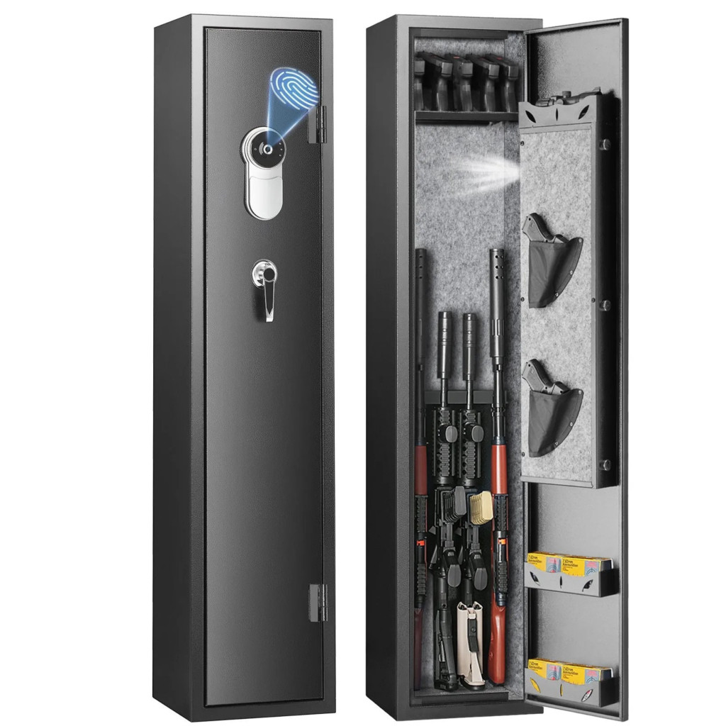 Ez az ujjlenyomatos fegyverszekrény 5 fegyverhez megbízható, modern és biztonságos megoldást kínál hosszú fegyverek és kézifegyverek rendszerezett, gyorsan hozzáférhető tárolására.