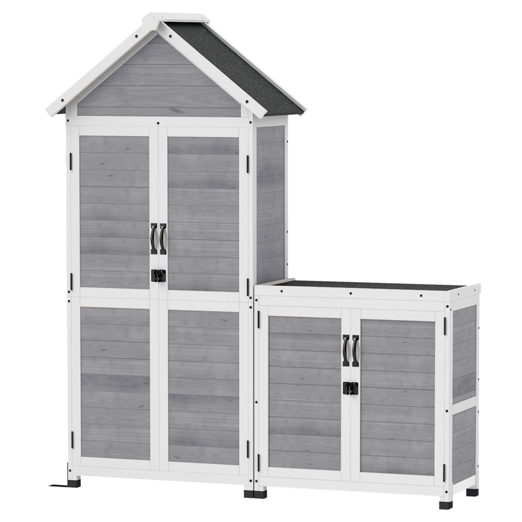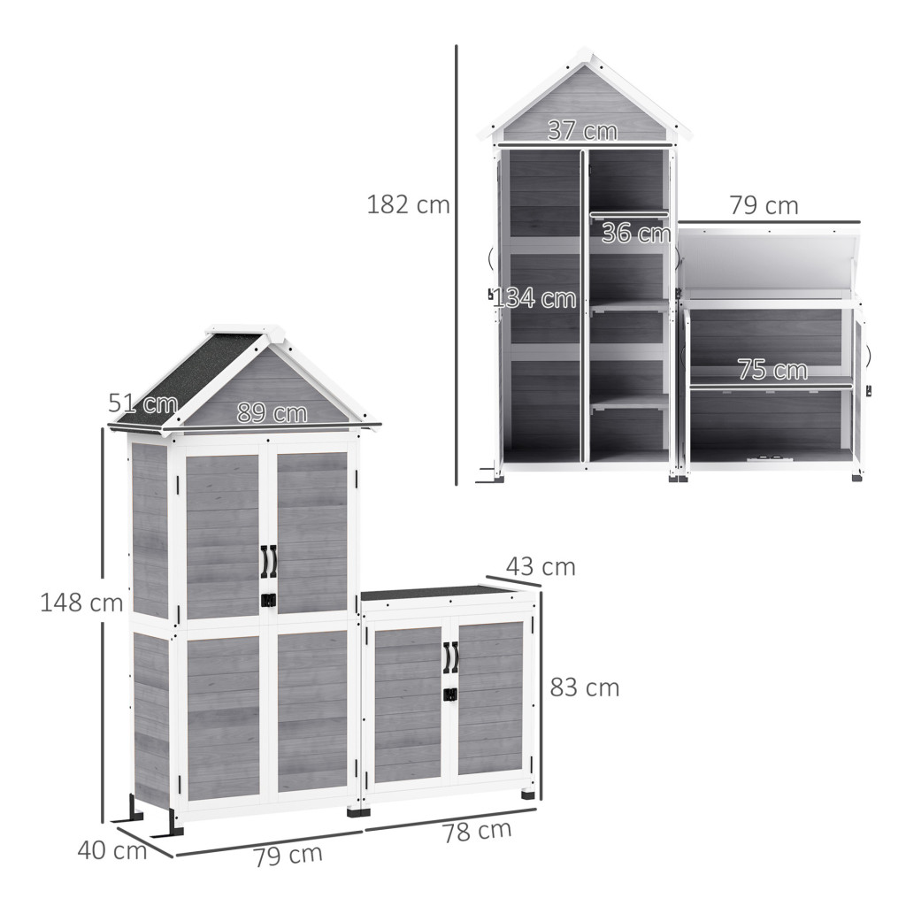 Ha praktikus és rendezett megoldást keres kerti eszközei tárolására, ez a fa kerti tárolószekrény zárható ajtóval ideális választás lehet. A masszív kerti szerszámtároló szekrény állítható polcokkal, különálló tárolórésszel és időjárásálló tetővel rendelkezik, így hatékonyan védi a kerti eszközöket az esőtől és a nedvességtől.