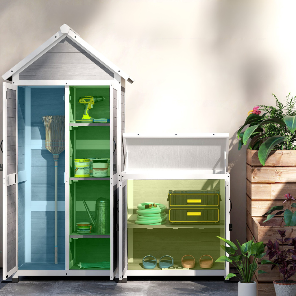 A világosszürke fa kerti szekrény modern megjelenésével tökéletesen illeszkedik a kert, terasz vagy erkély környezetébe, miközben tágas és jól rendszerezhető tárolóhelyet biztosít.